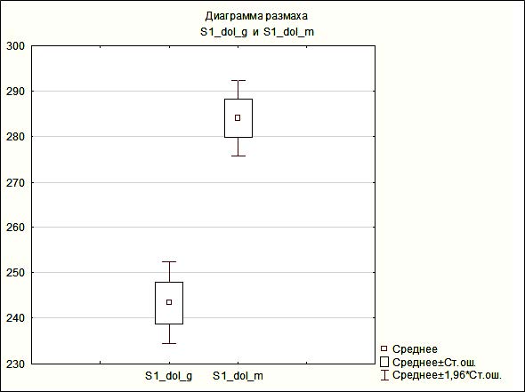 У девушек площадь сектора S1 колебалась от 157,47 до 387,58 мм², среднее значение – 243,36 мм². У юношей разброс составил от 156,32 до 397,47 мм² и среднее значение – 284,09 мм². Как видим, средние и максимальные значения у юношей выше, а минимальные практически равны.