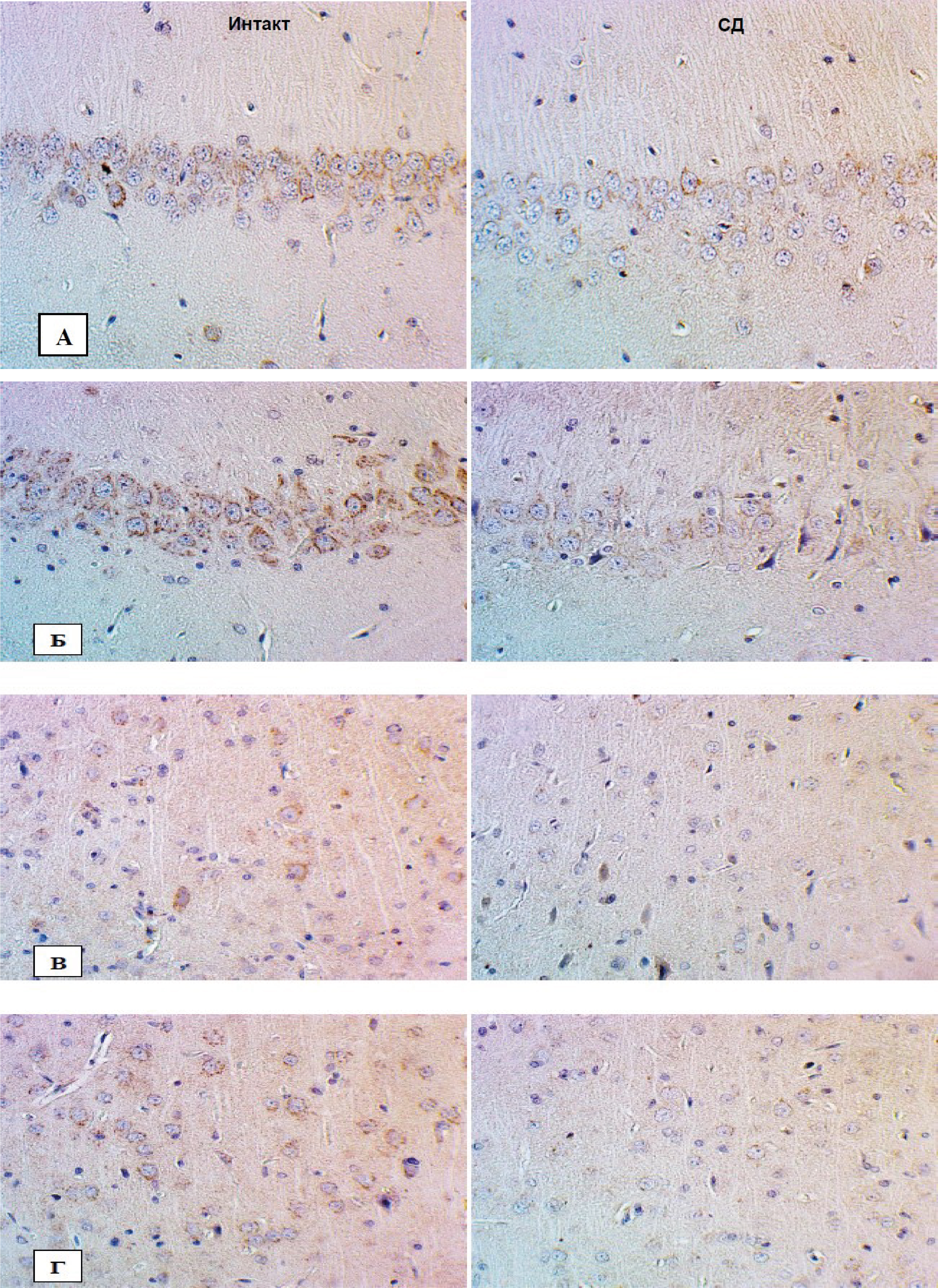 Рис. 1. Снижение экспрессии БК в структурах головного мозга при экспериментальной диабетической энцефалопатии: Б – СА3 поле гиппокампа; В – моторная кора; Г– соматосенсорная кора. Иммуногистохимическое исследование, антитела против БК, докраска гематоксилином. Увеличение ×400