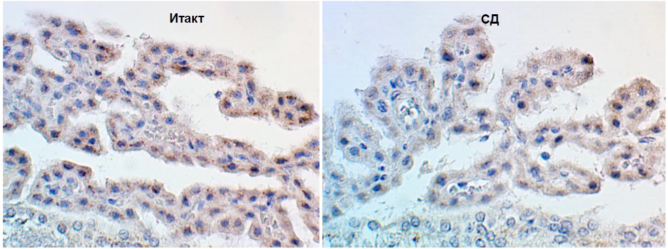 Для визуальной оценки интенсивности окраски срезы докрашивали гематоксилином. Интенсивность экспрессии на срезах оценивали с помощью программы анализа изображений ImageJ 1.54d. Определяли относительную площадь, занимаемую иммунопозитивным материалом в поле зрения микроскопа. Фотодокументирование осуществляли цифровой фотокамерой Olympus (Япония).