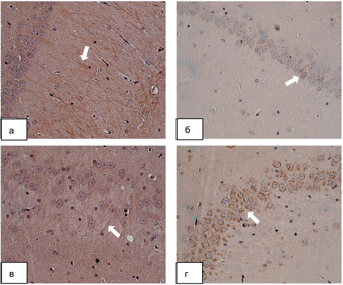 Рис. 1. Изменение экспрессии белка Klotho в цитоплазме нейронов гипокампа крыс при экспериментальном сахарном диабете: а – группа интактных животных (крысы без СД); б – группа животных с сахарным диабетом (СД); в – группа животных с сахарным диабетом и фармакокоррекцией аминалоном (СД + аминалон); г – группа животных с сахарным диабетом и фармакокоррекцией сукцикардом (СД + сукцикард). Иммуногистохимическое исследование, антитела против белка Klotho, докраска гематоксилином. Увеличение ×400. Белые стрелки – экспрессия ИРМ