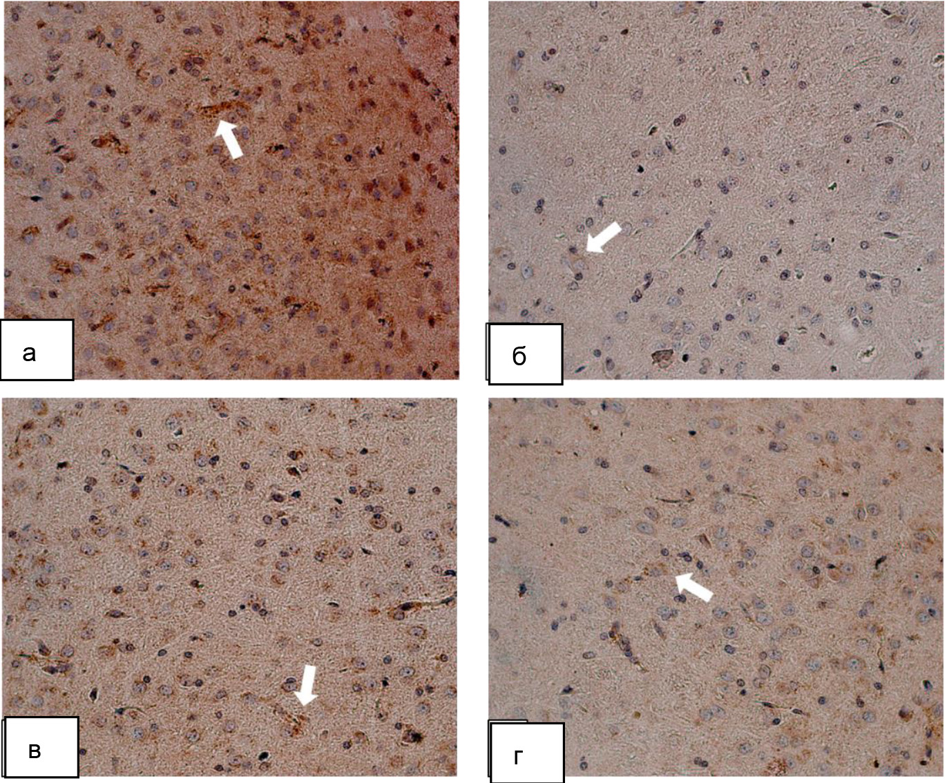 Рис. 2. Изменение экспрессии белка Klotho в цитоплазме нейронов гипоталамуса крыс при экспериментальном сахарном диабете: а – группа интактных животных (крысы без СД); б – группа животных с сахарным диабетом (СД); в – группа животных с сахарным диабетом и фармакокоррекцией аминалоном (СД + аминалон); г – группа животных с сахарным диабетом и фармакокоррекцией сукцикардом (СД + сукцикард). Иммуногистохимическое исследование, антитела против белка Klotho, докраска гематоксилином. Увеличение ×400. Белые стрелки – экспрессия ИРМ
