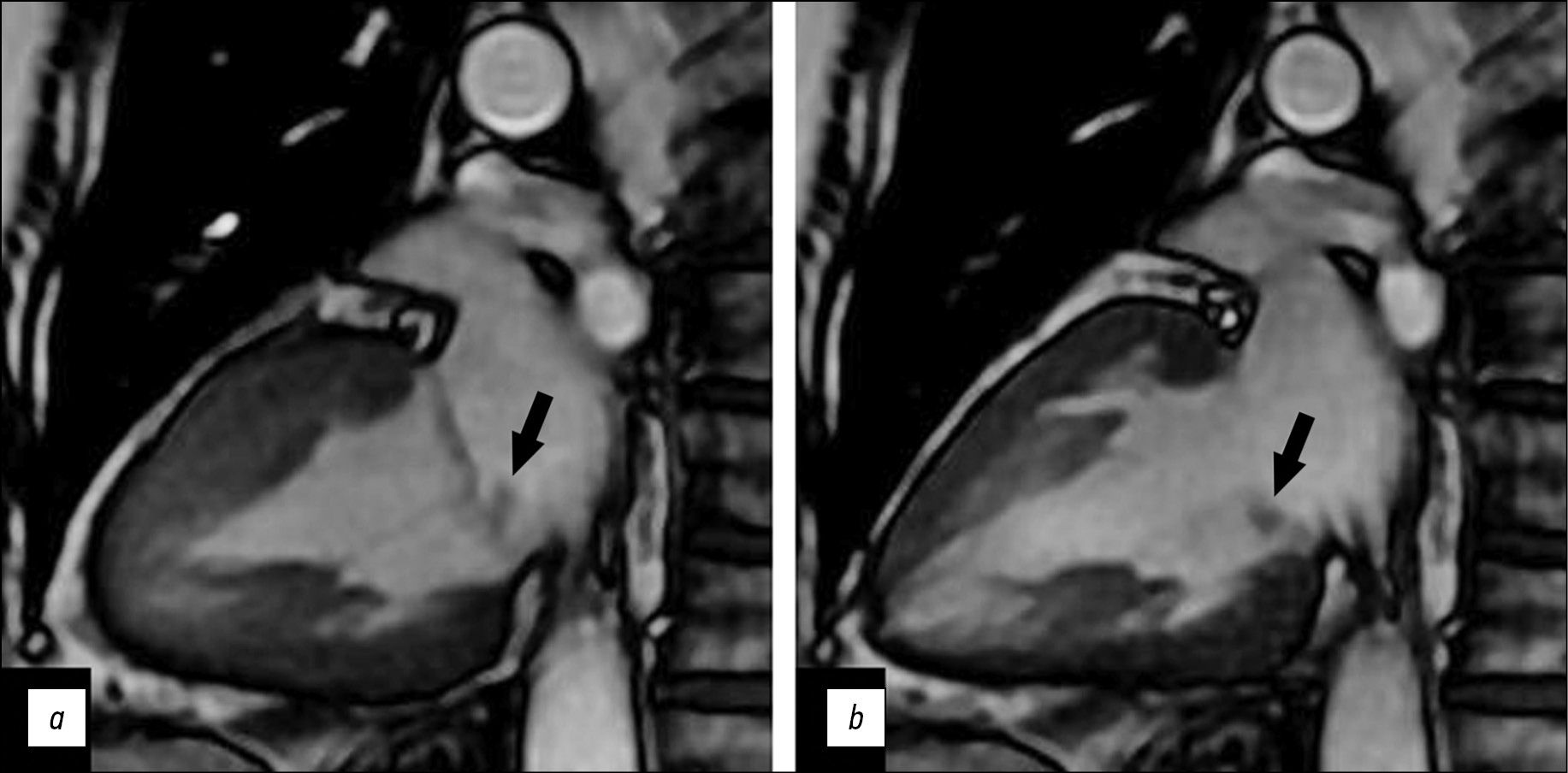 Fig. 2. Magnetic resonance imaging of the heart, two-chamber view: a, left ventricular systolic phase; b, left ventricular diastolic phase. Additional mass on the posterior mitral valve leaflet (black arrows).