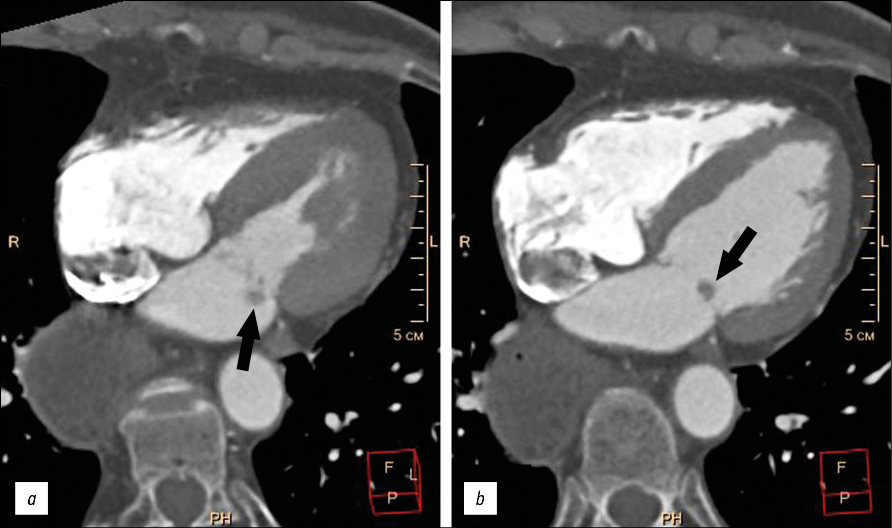 Fig. 1. Multispiral computed tomography of thoracic organs, four-chamber planar heart reconstruction, arterial contrast phase: а, left ventricular systolic phase; b, left ventricular diastolic phase. Additional rounded structure on the posterior mitral valve leaflet (black arrows).