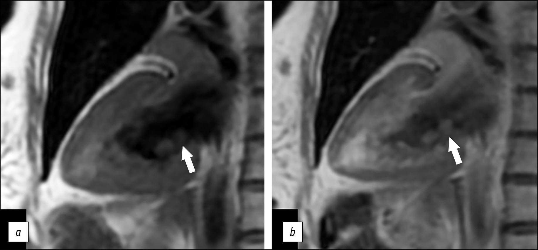 4. Fig. 3. Magnetic resonance imaging of the heart, two-chamber view: a, native T1-WI series, TSE; b, postcontrast T1-WI series, TSE. Additional mass on the posterior mitral valve leaflet (white arrows).