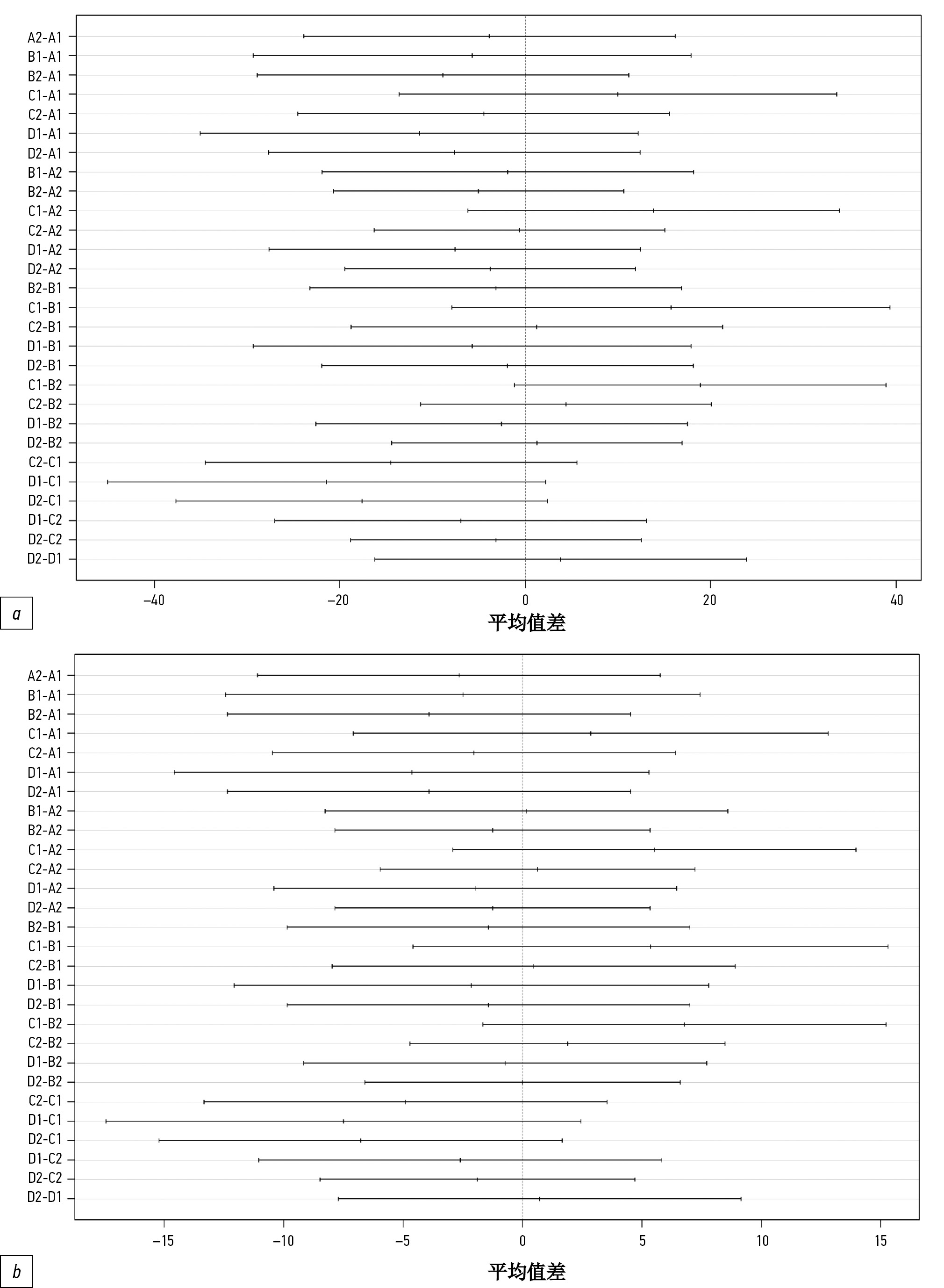 Fig. 2. A post-post-hoc analysis of our hypothesis for the similarity of means: (a) binary classification; (b) normalized classification (Sharp CT, Soft CT, Sharp LDCT, and Soft LDCT protocols are coded with A, B, C, and D, respectively; the normal weight group is coded with “1”; the overweight group is coded with “2”).