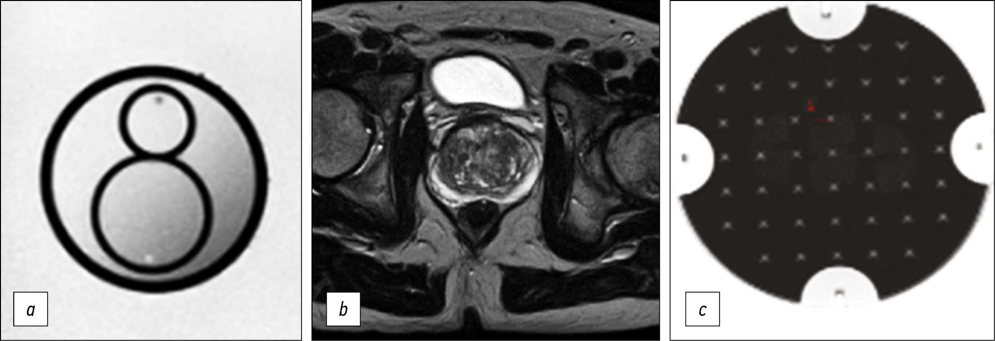Fig. 1. Evaluation of visualization quality: a) prostate phantom; b - patient; c) phantom of the American Society of Radiology (ACR).