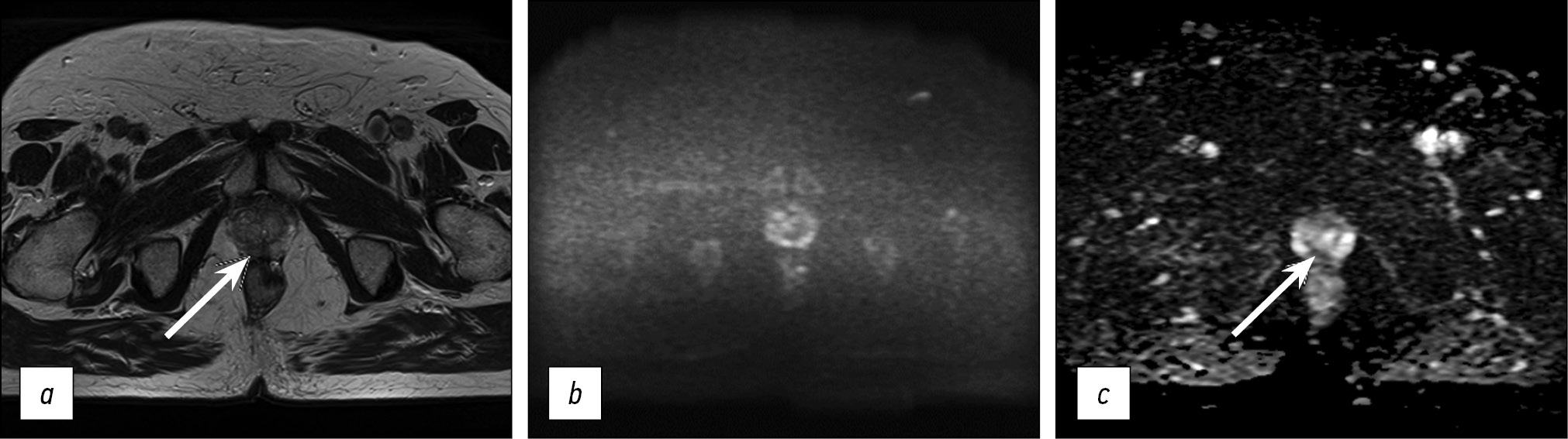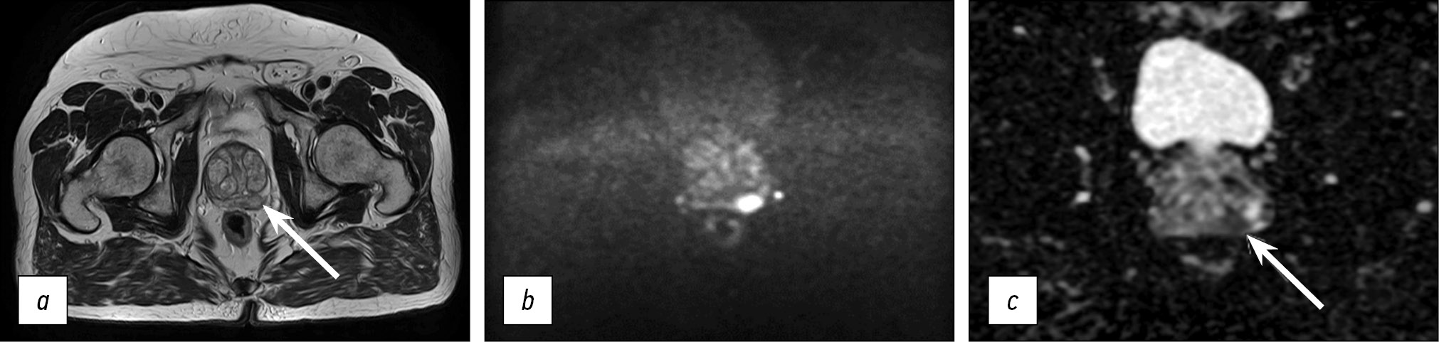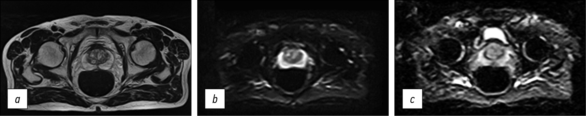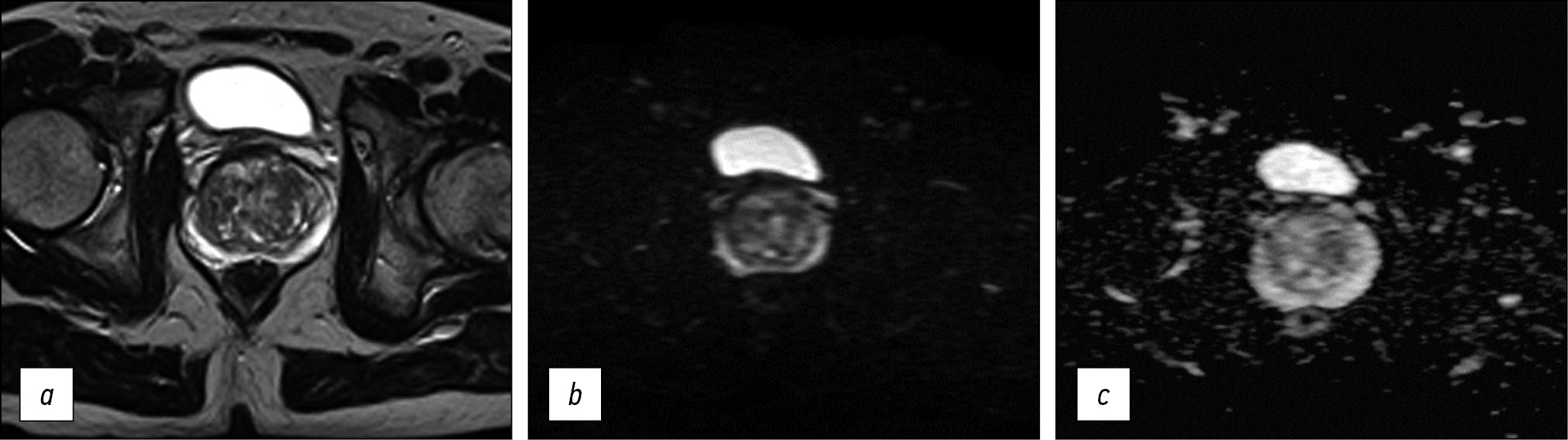 Fig. 5. Images obtained using the accelerated protocol of biparametric magnetic resonance imaging. Patient with prostate changes consistent with PI-RADS 2: a) T2-WI, axial view; b, c) DWI and ICD.