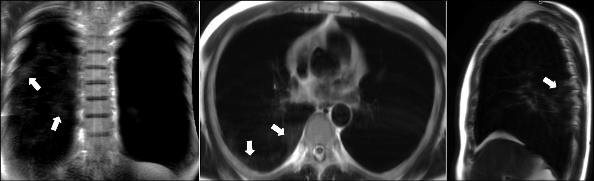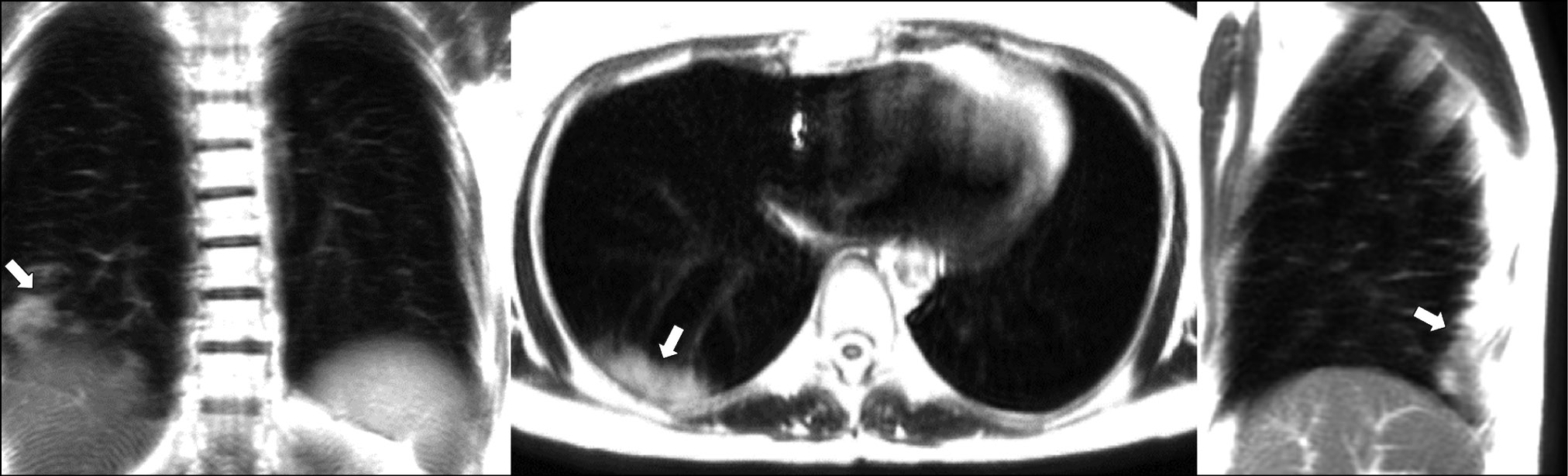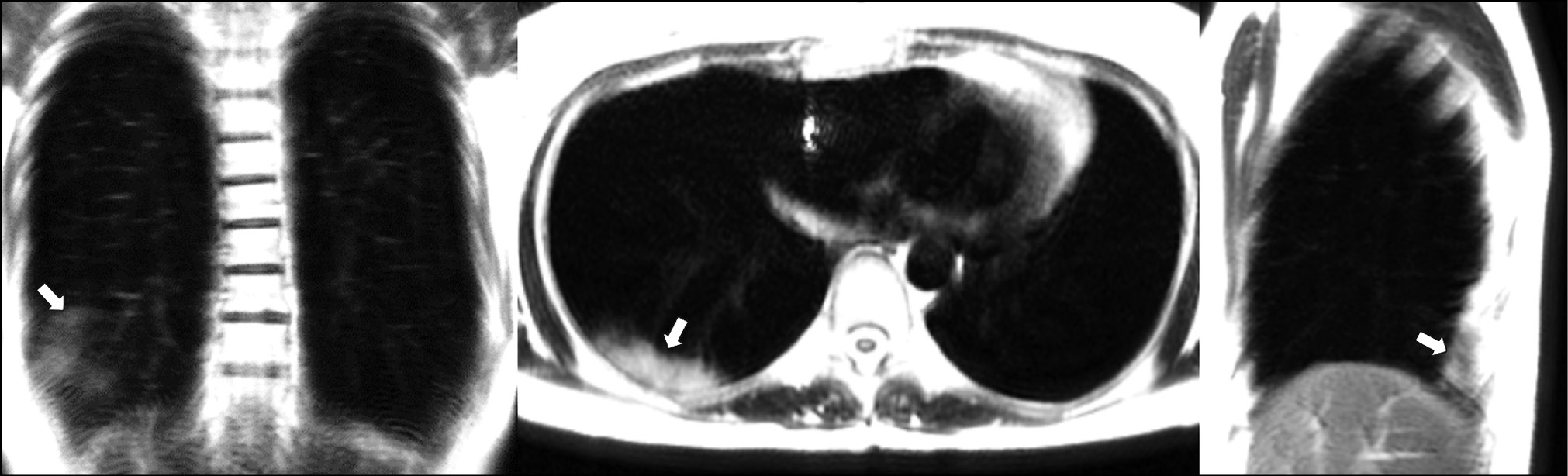 Figure 1. Dynamic magnetic resonance imaging of the lungs during inhalation in the coronal, axial, and sagittal planes. In the axial and sagittal planes, arrows point to areas of compaction. In the coronal plane, the arrow points to a “cloudy sky” (S9–S10).