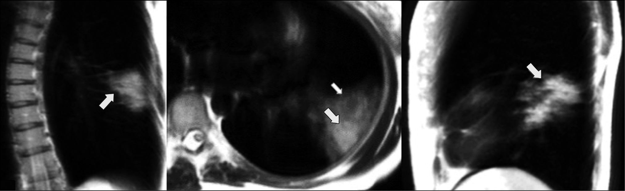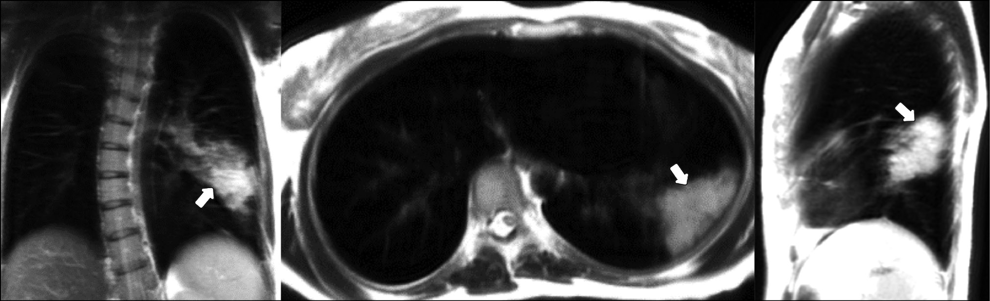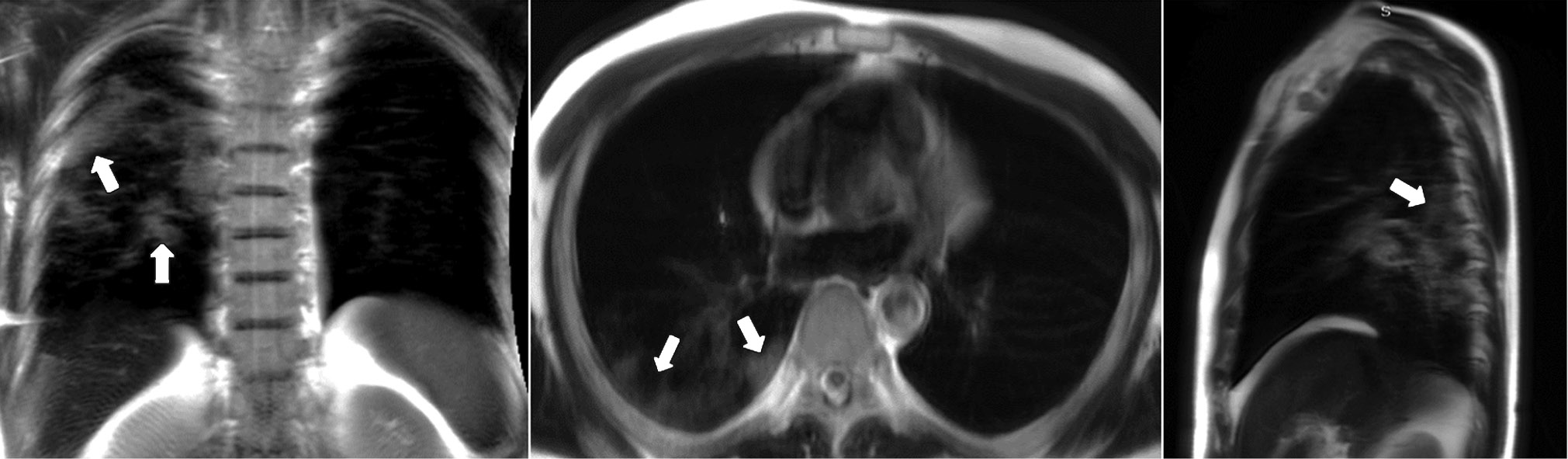 Figure 2. Dynamic magnetic resonance imaging of the lungs during exhalation in the coronal, axial, and sagittal planes. Arrows indicate the areas of consolidation (S9–S10).