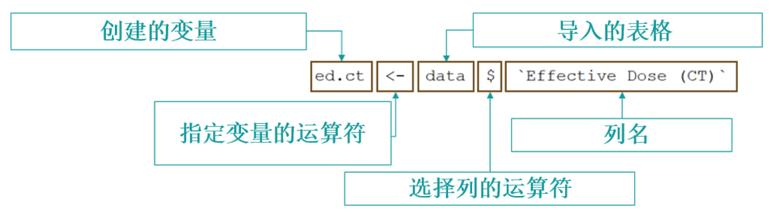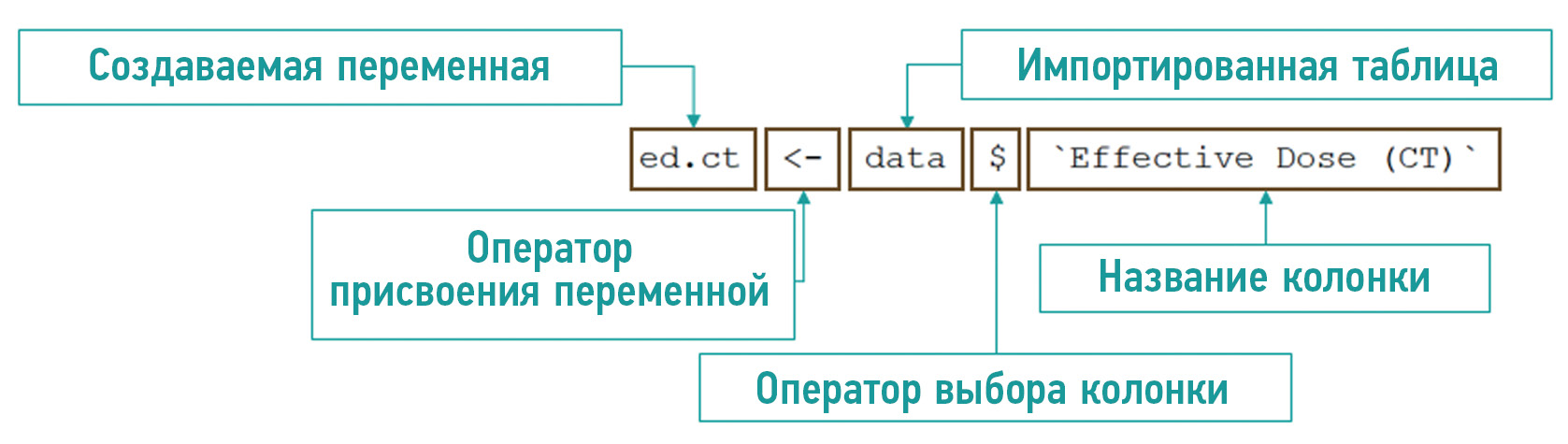 Fig. 3. Generating a separate variable for the effective dose of computed tomography with the functions of each command element is indicated.