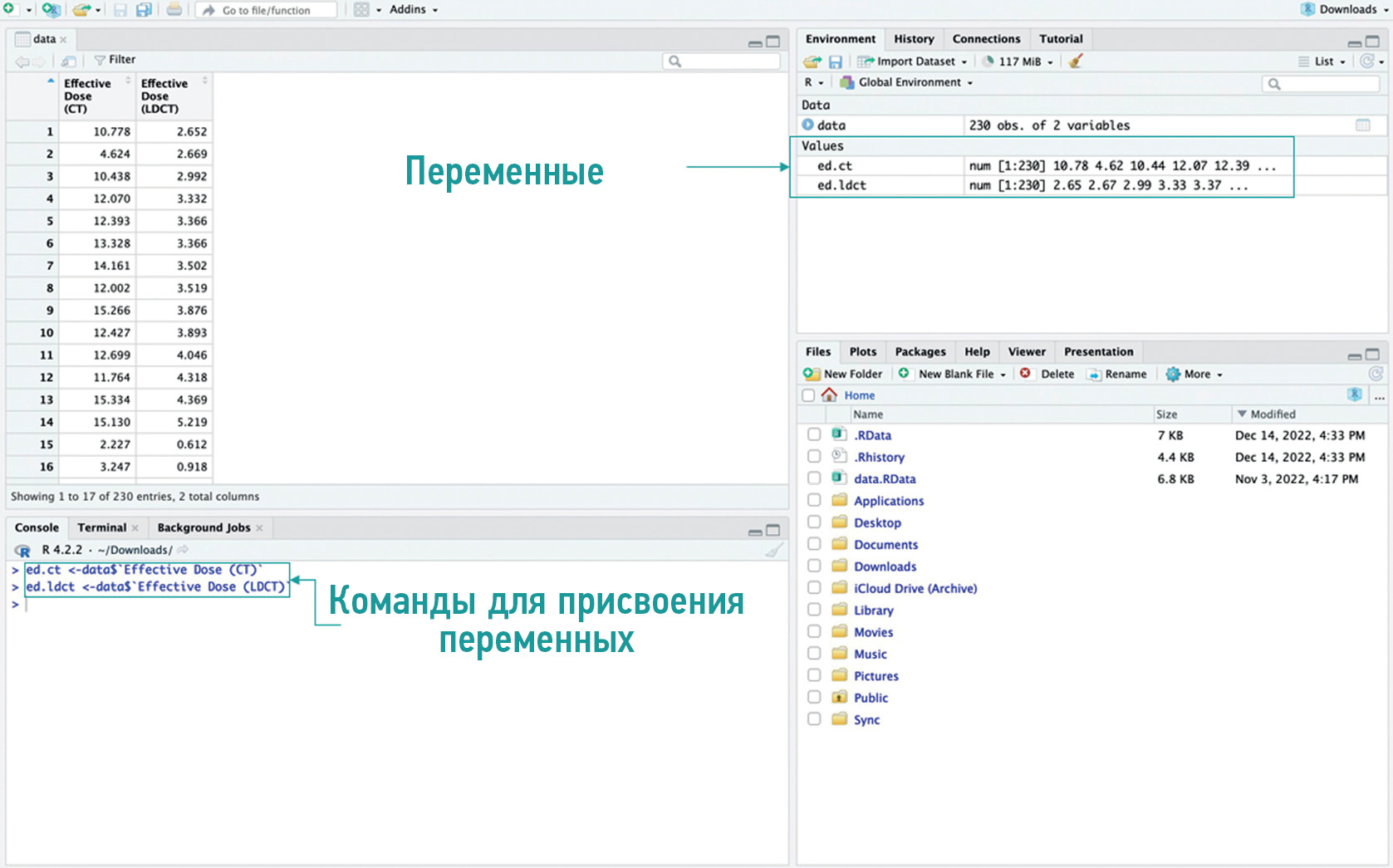 After import, the program interface changes; a “data” variable is displayed in the environment block (Fig. 2). A new area also appeared in the upper left quadrant. This is a data-view block with the loaded table displayed. The comparison columns in the table are named as “Effective Dose (CT)” and “Effective Dose (LDCT).” Latin was used in the column names to avoid problems with encoding and incorrect display of characters in Posit.