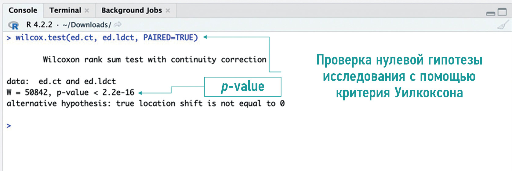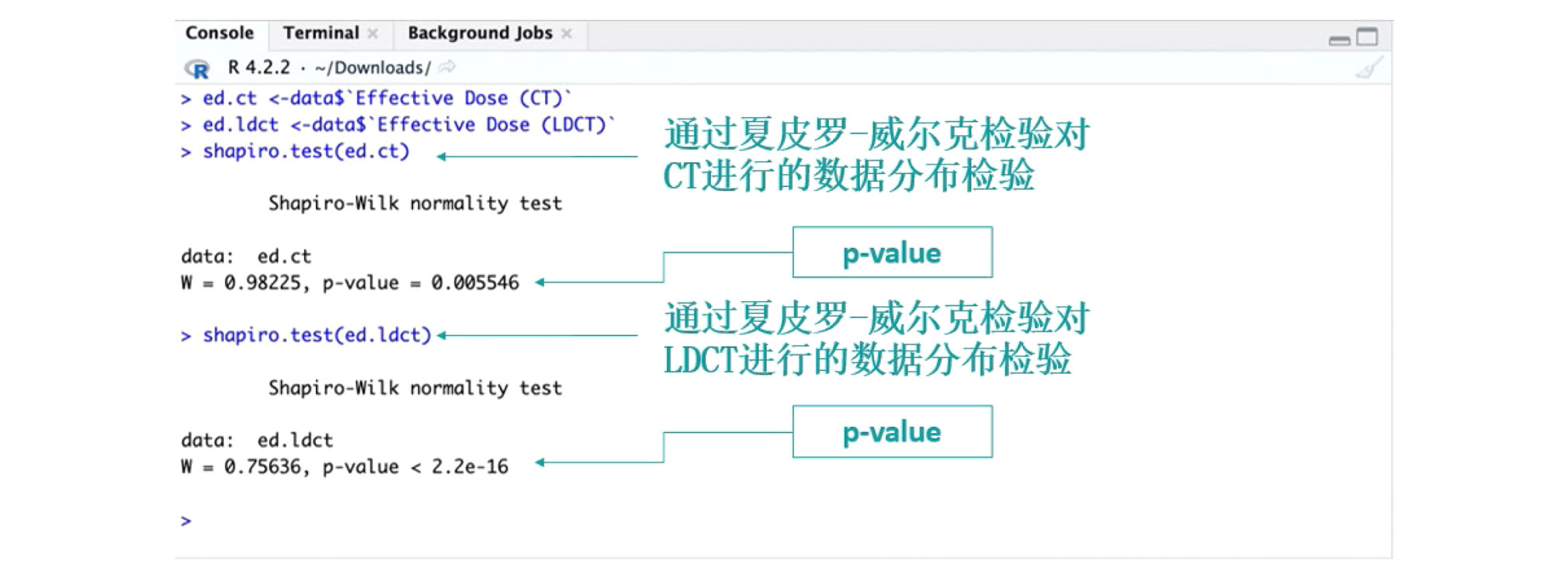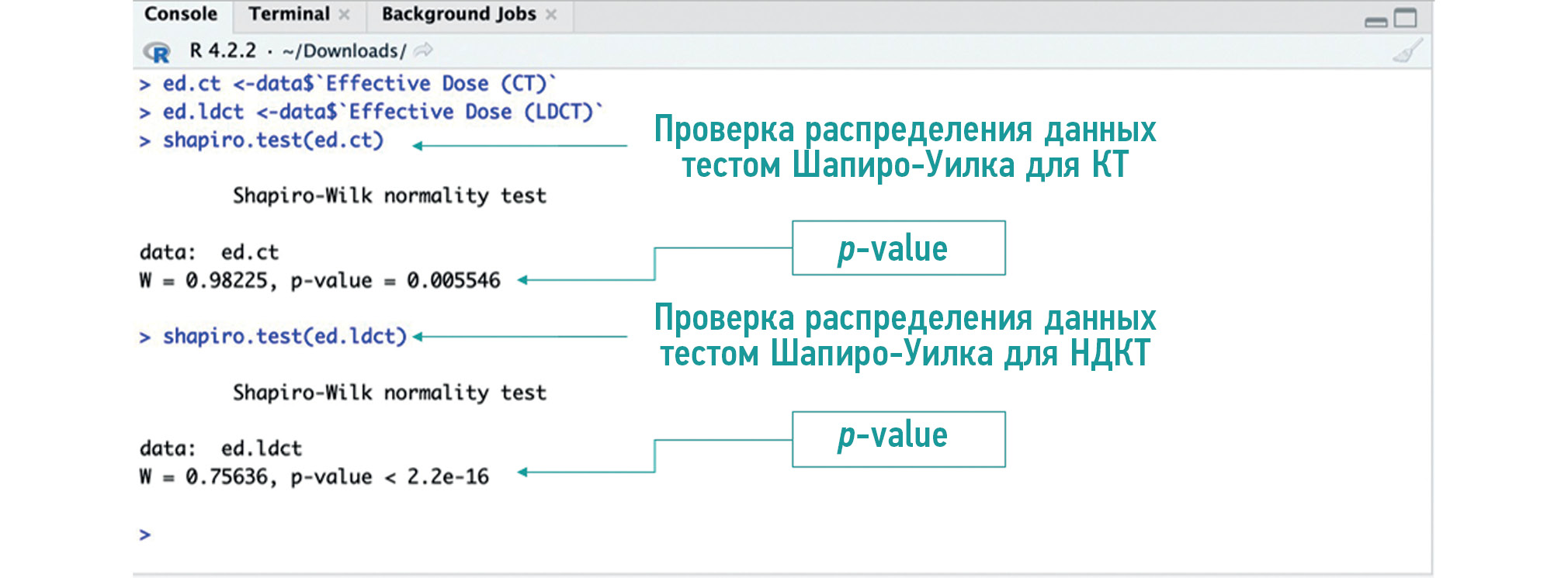 We present a practical guide for comparing two groups using the software R. This study compares the effective doses of standard computed tomography with low-dose computed tomography for COVID-19 patients. The practical guide summarizes theoretical approaches to medical data processing and recommendations for correctly formulating research tasks and selecting optimal statistical analysis methods.