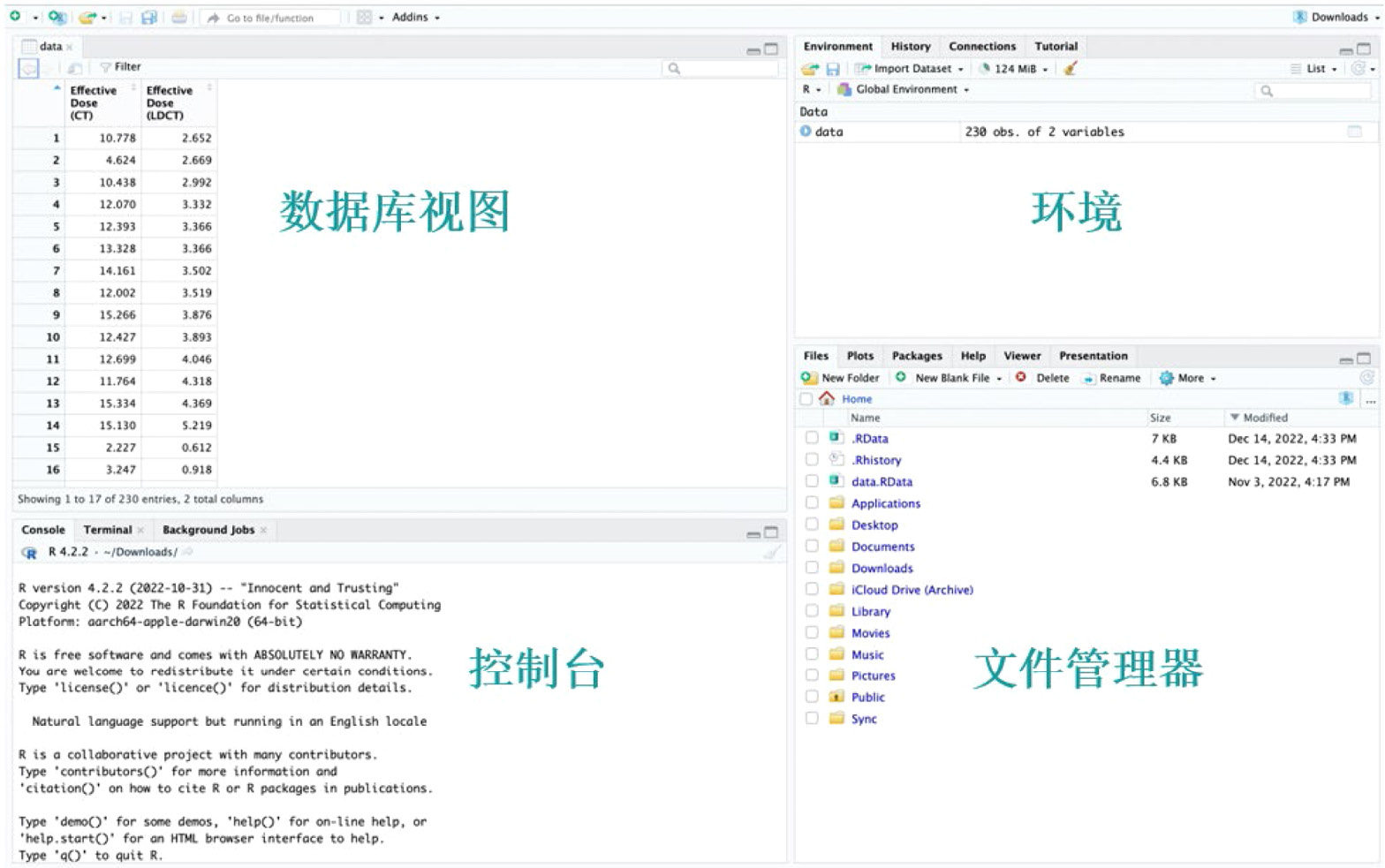 Fig. 1. The Posit interface shows areas of the console, environment, and files.