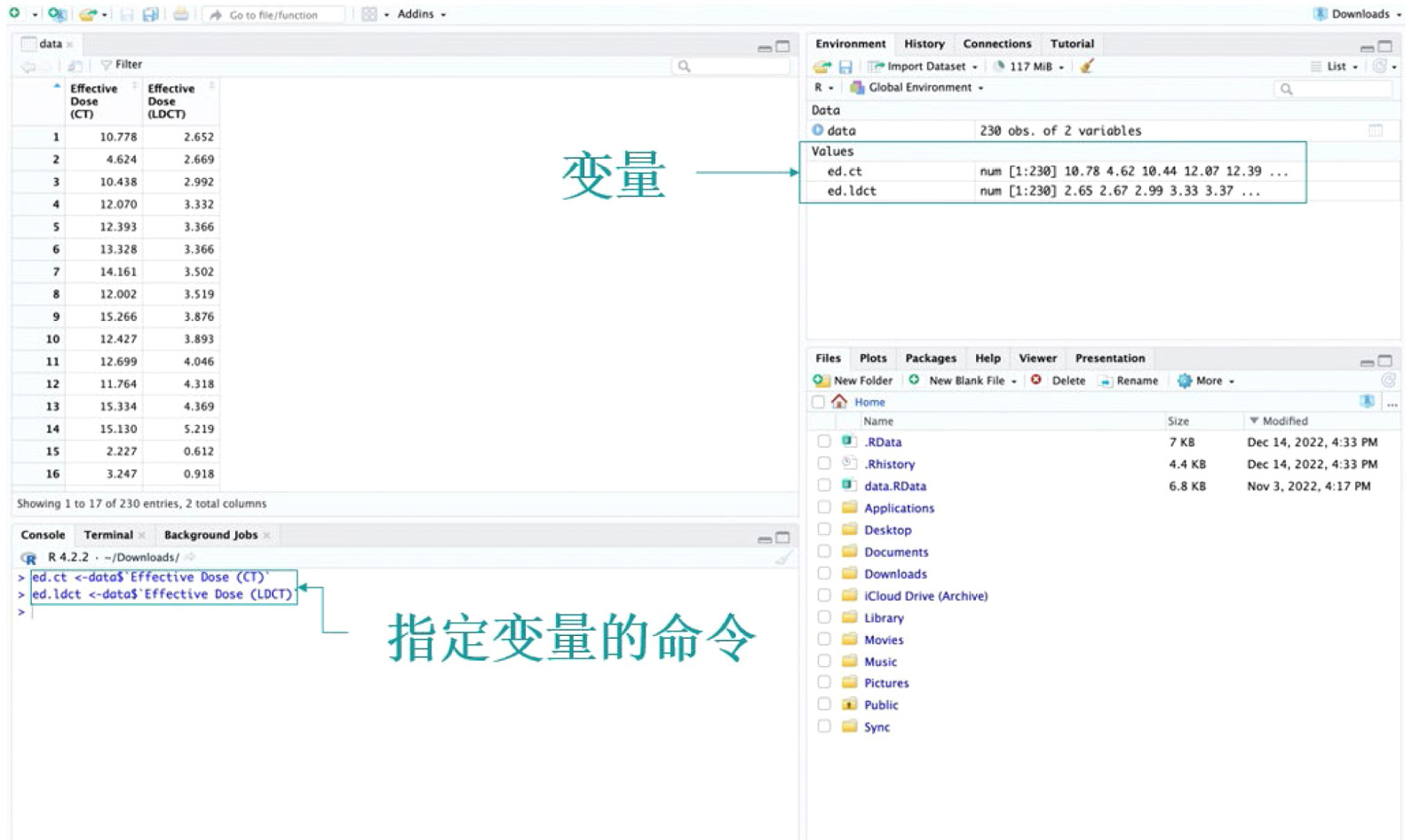 The aim of this paper is to present some basic operations in R based on a real-life problem as follows: comparing the effective dose received by patients during standard computed tomography (CT) and low-dose computed tomography (LDCT) for COVID-19. The relevance of this task is based on the need to monitor radiation exposure [9], considering the increased number of imaging studies [10] resulting in the importance of developing [11] and clinical testing [12, 13] LDCT protocols.