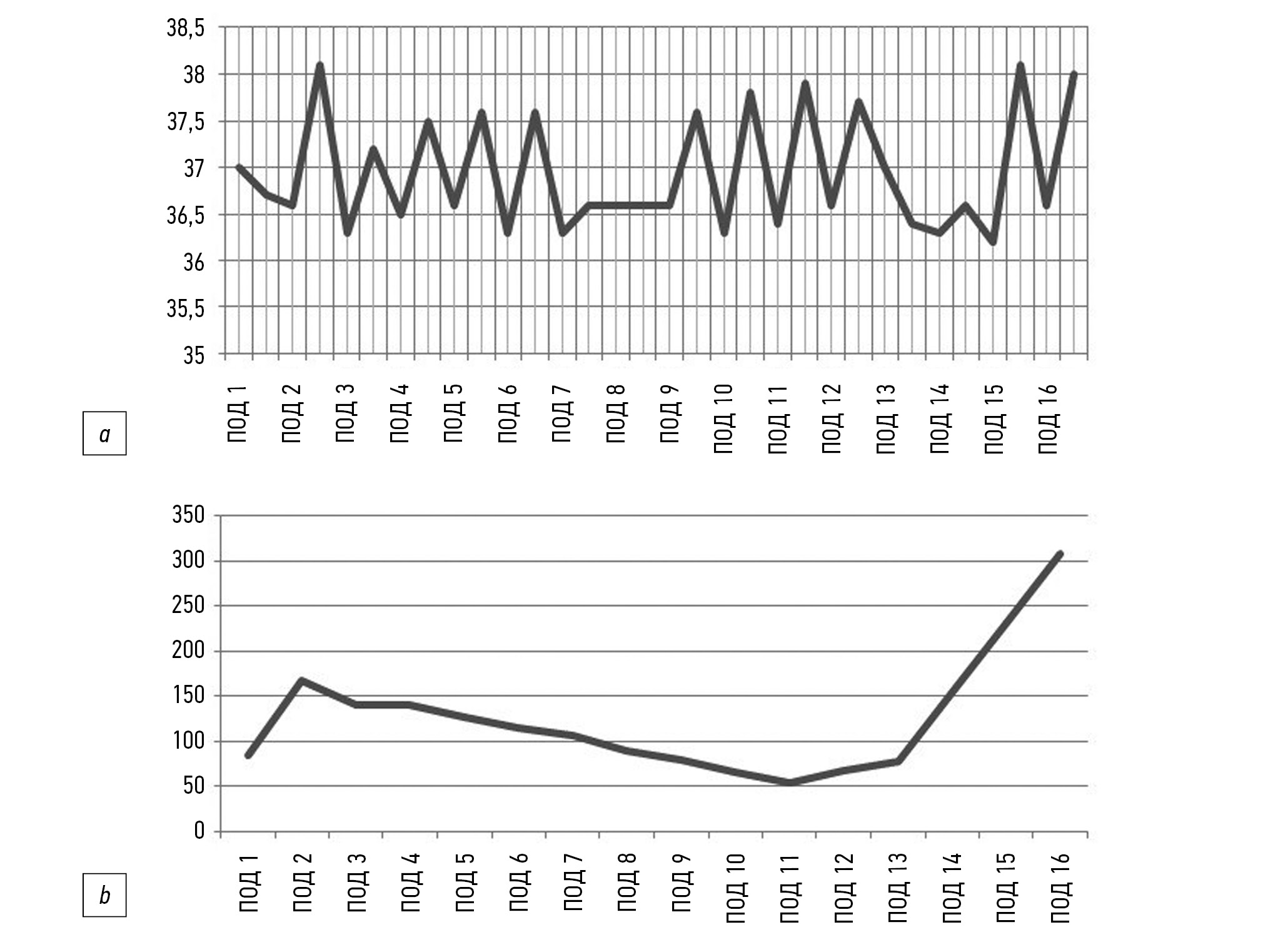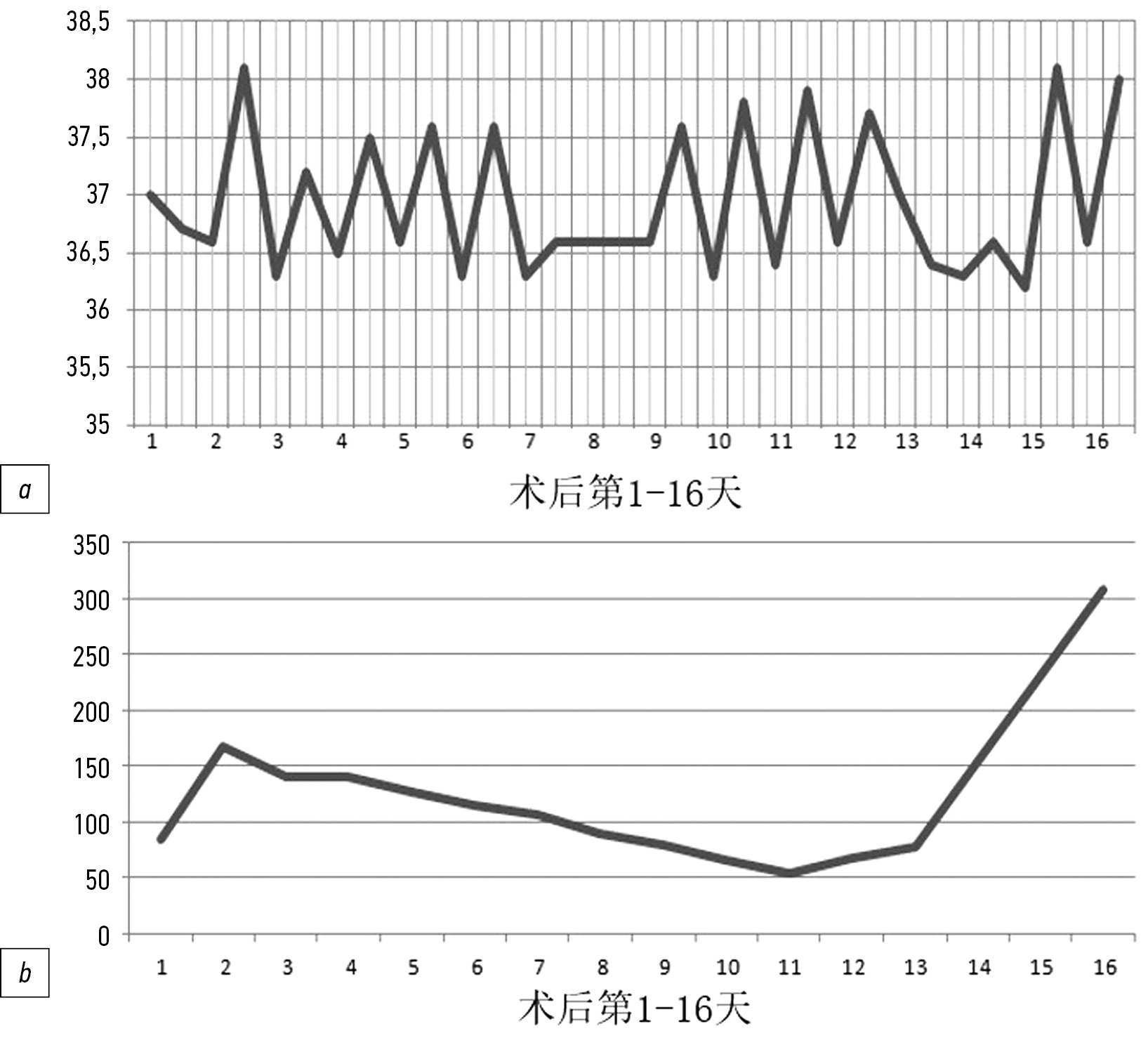 Figure 1. Body temperature (а; ℃) and serum C-reactive protein (b; mg/L) on postoperative day (POD) 1 to the relaparotomy (POD 16).