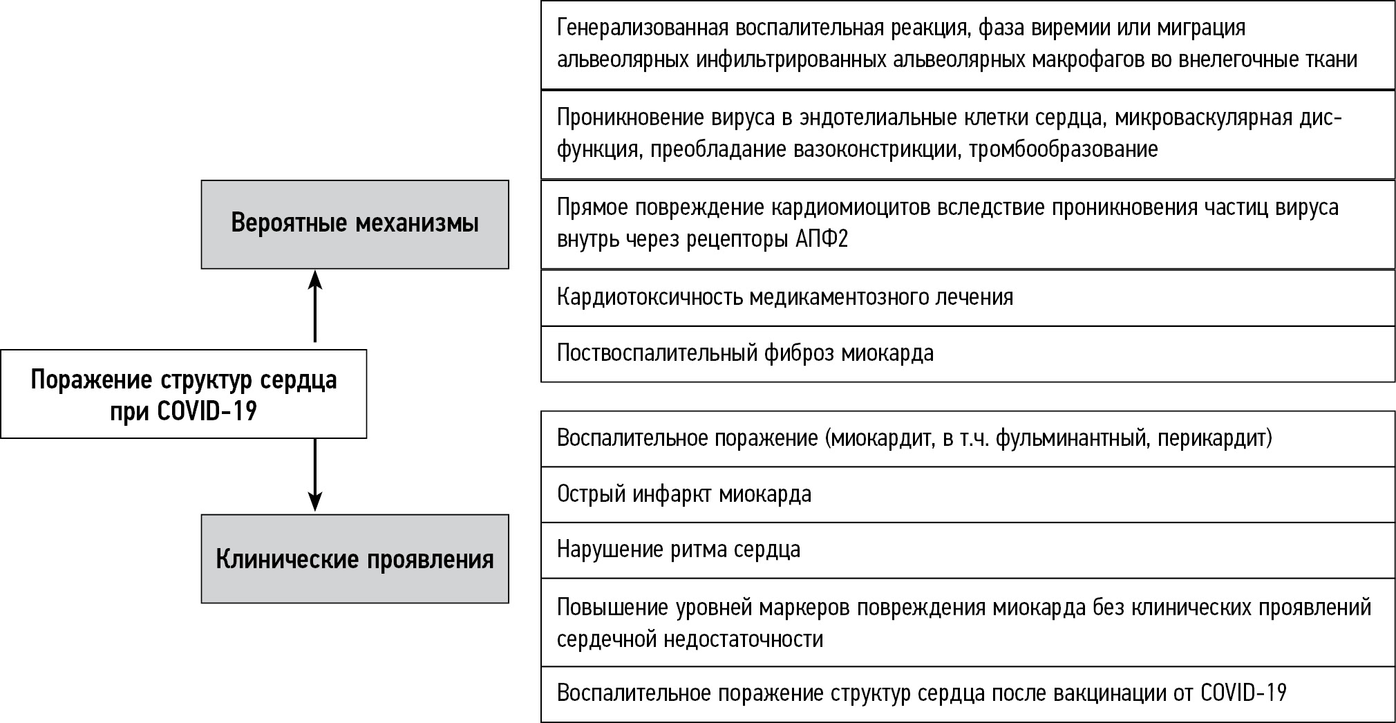 Coronavirus infection is still a topic of interest in the medical community today. Among the heterogeneous clinical manifestations of this disease, lesions of cardiac structures often occur. They are mainly inflammatory in nature and can be acute or delayed. Aside from myocarditis, coronavirus infection can induce cardiac injuries, including acute coronary syndrome, thromboembolic events, heart failure, and heart rhythm disturbances. It is well known that the prognosis for patients with cardiac lesions significantly worsens; timely diagnosis and treatment initiation play an important role in preventing severe complications.