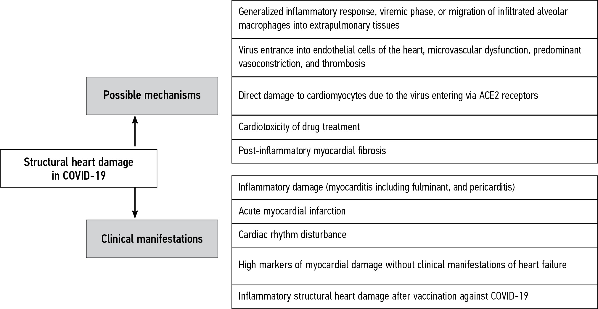 Fig. 1. Main mechanisms of structural damage in the heart of patients with COVID-19 and the clinical manifestations they cause.