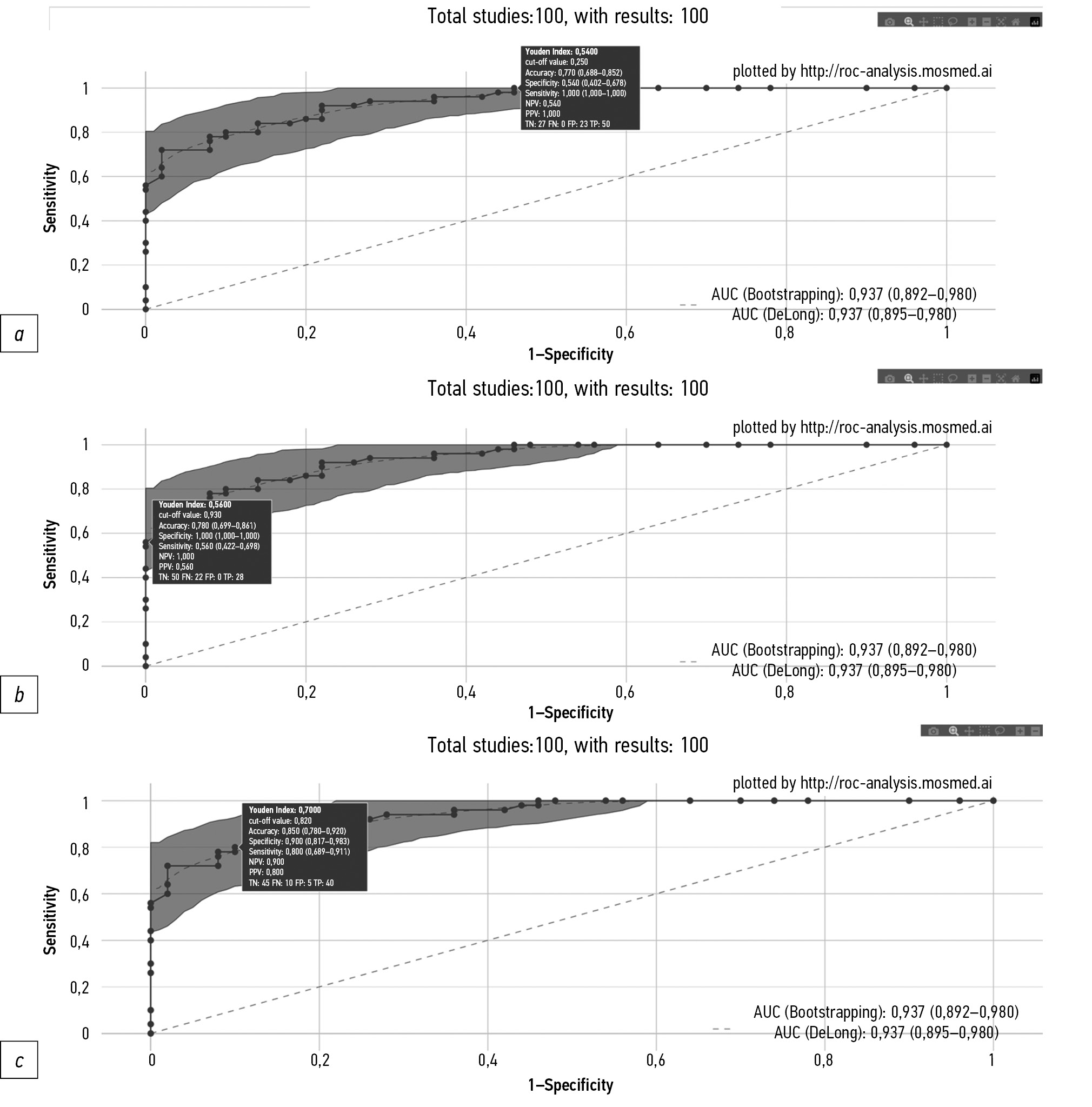 - Patent RUS № 2022617324/05.04.2022. Byul. № 4. Morozov SP, Andreichenko AE, Chetverikov SF, et al. A web-based tool for performing ROC analysis of diagnostic test results. Available from: https://www.elibrary.ru/item.asp?id=48373757. Accessed: 10.03.2023. (In Russ).