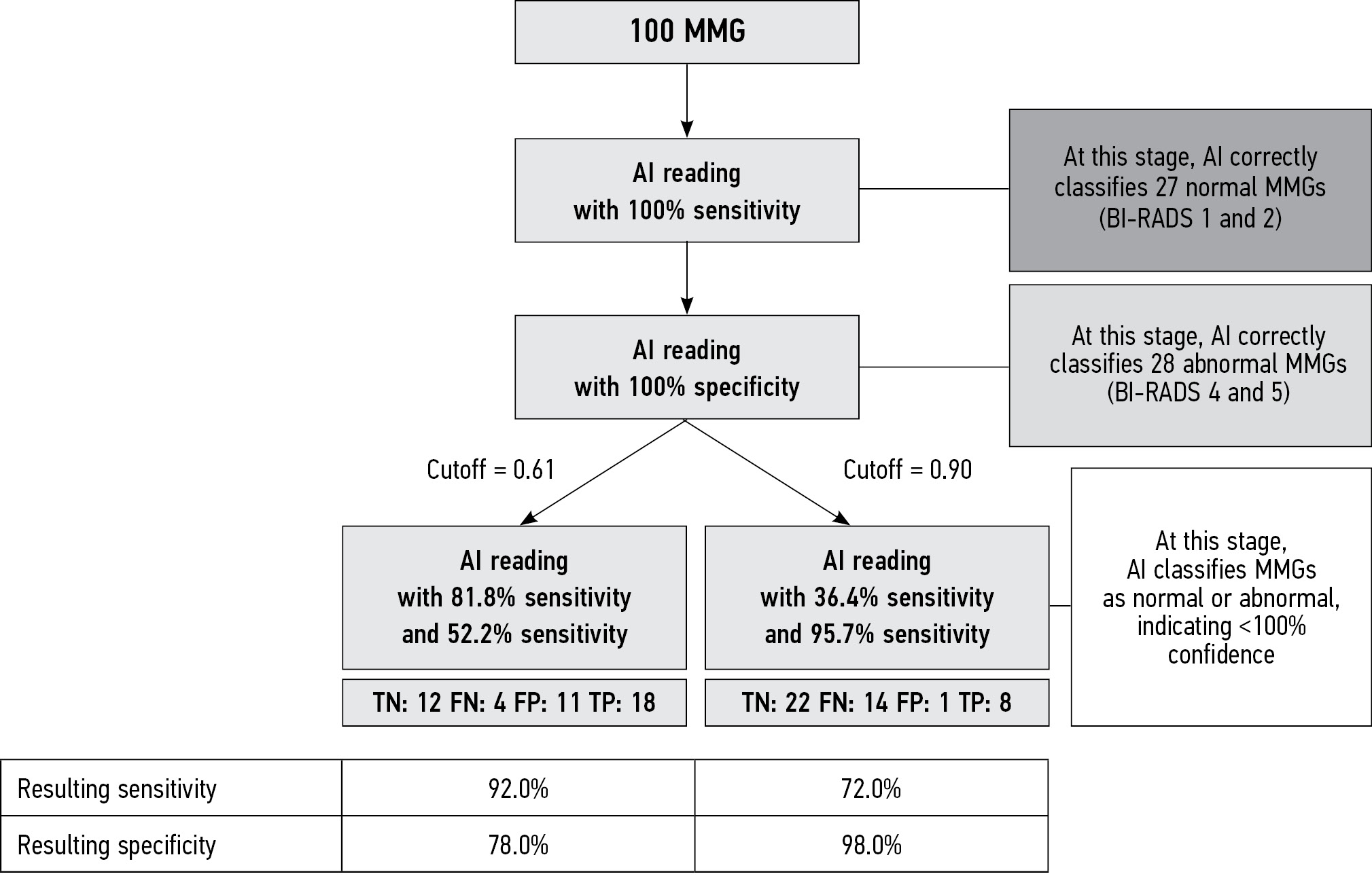 Note: AI, artificial intelligence; FN, false negative; FP, false positive; MMG, mammogram; TN, true negative; TP, true positive.