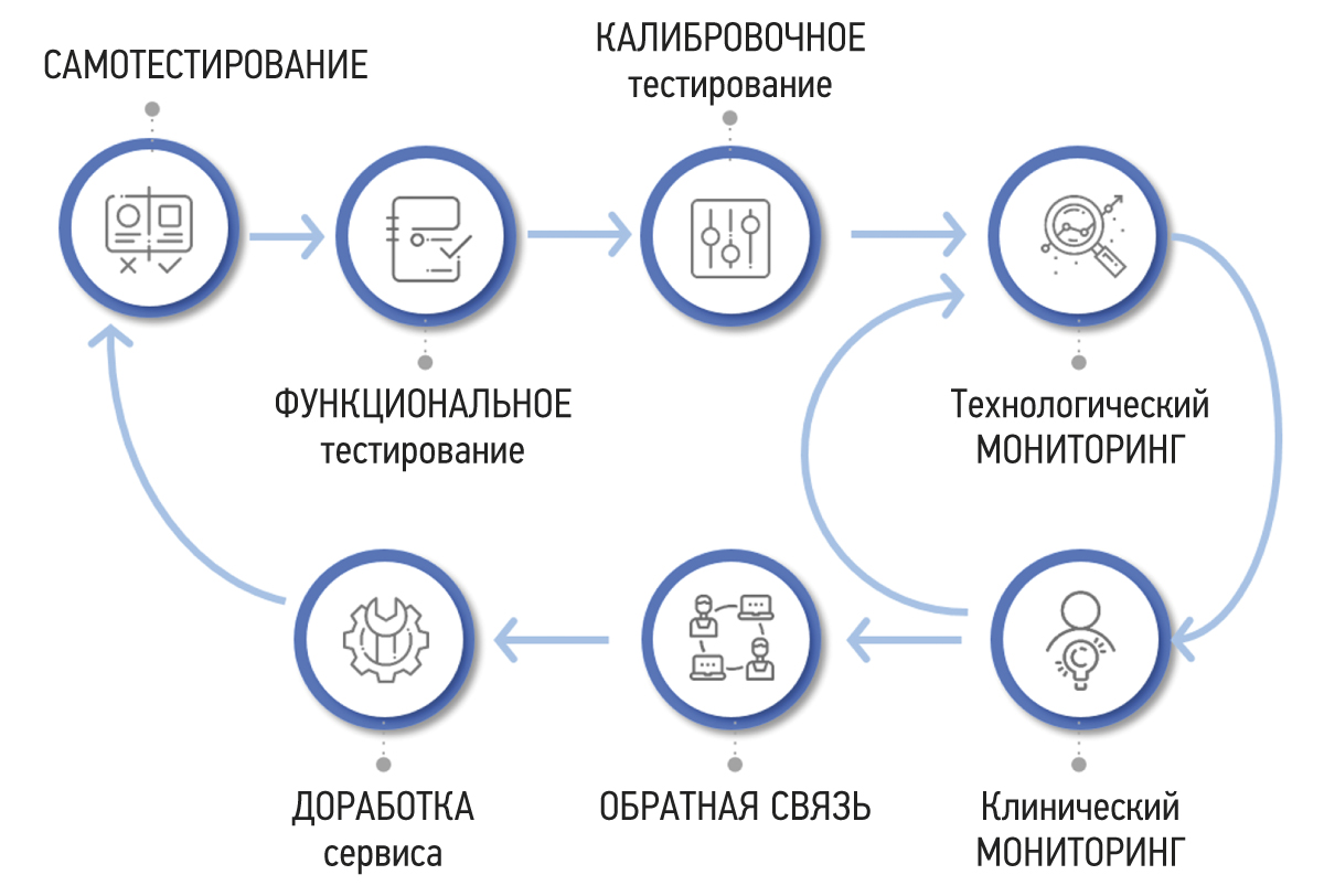 RESULTS: A methodology for testing and monitoring AI-based software for medical diagnostics has been developed, aimed at improving its quality and introducing it into practical healthcare. The methodology consists of seven stages: self-testing, functional testing, calibration testing, technological monitoring, clinical monitoring, feedback, and refinement.