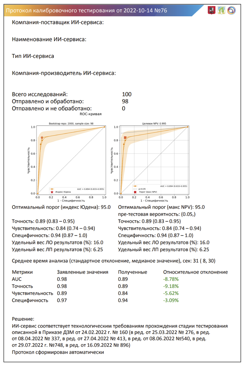 Calibration testing is a stage wherein the diagnostic accuracy of software is determined. The main parameter is the area under the ROC curve (AUC). The optimal value of the activation threshold is determined by examining the ROC curve using Youden’s J statistic and maximizing the negative and positive predictive value. Other metrics include sensitivity, specificity, accuracy, and positive and negative predictive values. The minimum, average, and maximum time required to analyze one examination are also determined, and numbers of true positive, false negative, false positive, and true negative results are presented as a four-field table. Threshold values for some parameters are as follows: AUC ≥0.81 or 0.91 (depending on the clinical task); time spent on acceptance, processing of the study, and transmission of analysis results ≤6.5 min; and percentage of successfully processed examinations ≥90% [21].18
