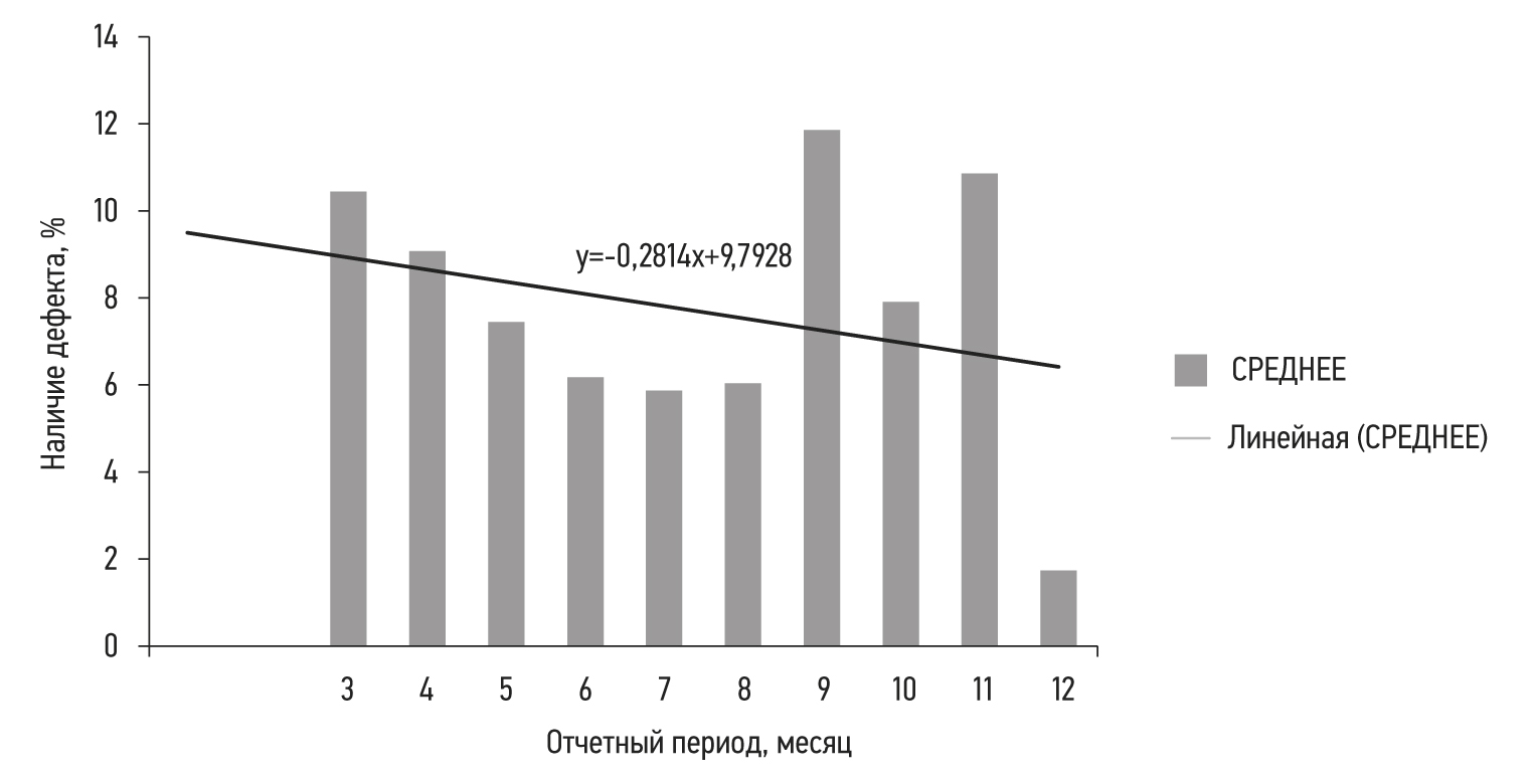 Defects “a” and “b” are monitored automatically for all examinations reviewed by software during the reporting period. For defects “c” and “d,” semi-automatical monitoring is used with a sample of 80 examinations. An internal report form for monitoring software operation with instructions for monitoring technological defects has been developed for accurate defect assessment (Figure 7). Figure 8 shows graphical information on the average number of technological defects for the “chest radiography” area, with a tendency for the number of defects to decrease.
