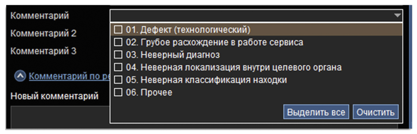 The stage of radiologist feedback is required to assess the software’s practical relevance. The feedback form is in the program window on the radiologist’s automated workstation (Figure 11). The software’s result may be agreed upon or disagreed upon by a radiologist. In case of disagreement, they select a reason. The primary causes include technological defects and diagnostic inaccuracy. It is necessary to obtain specialist feedback on 5% of all examinations assessed by software. In addition, feedback is collected through a survey of specialists to determine their satisfaction with the software.22