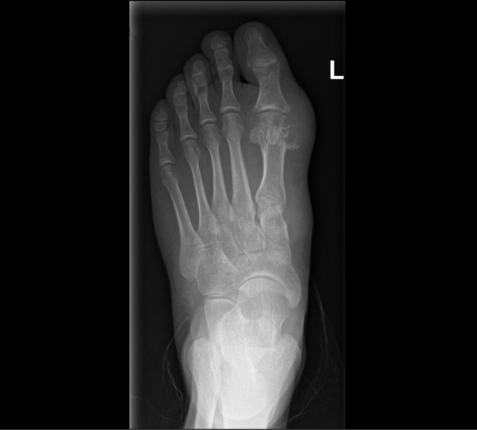 Typical radiographic signs of gout are punched-out bone erosions with sclerotic contours and overhanging borders, also known as “rat bite” or “gull wing” erosions (Fig. 1).