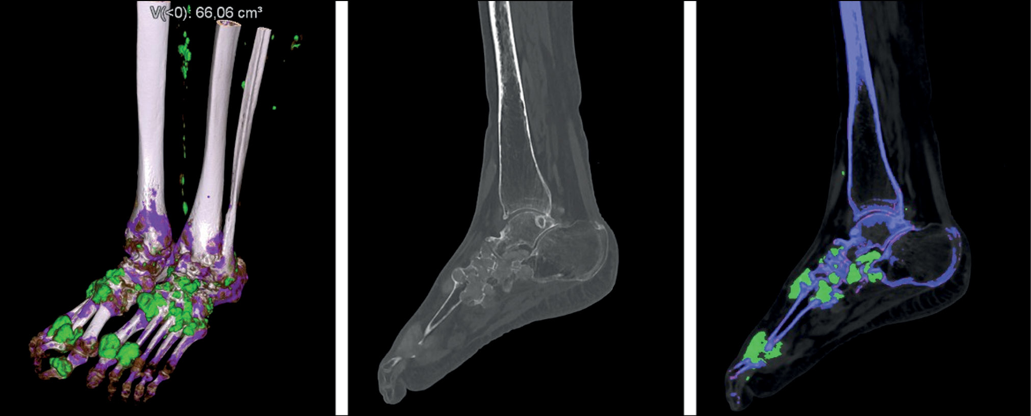 Fig. 2. Three-dimensional reconstruction, blended and color-coded image (right ankle joint and small foot joints): blue, pink, and green represent cortical bone, cancellous bone, and monosodium urate crystals, respectively (dual-energy computed tomography findings of the Medical Research and Education Center of the Lomonosov Moscow State University).