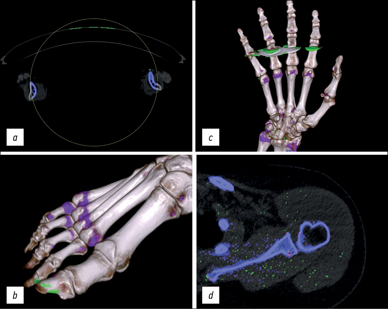 These criteria can be used if the patient has an “input sign”: at least one episode of pain and edema in a peripheral joint or joint capsule. The presence of monosodium urate crystals in the synovial fluid or tophaceous tissue (macroscopic conglomerates of monosodium urate surrounded by granulomatous inflammation) by polarized light microscopy is a sufficient criterion for diagnosing gout, making this method the gold standard. In the absence of a sufficient criterion, clinical (typical clinical symptoms of gout, tophi detection, and temporal pattern of an attack), laboratory (serum uric acid level and synovial fluid analysis), and instrumental (ultrasonography of the affected joint and dual-energy computed tomography [CT]) diagnosis methods must be used. Each criterion is assigned a certain number of points, based on its degree of specificity. The ACR/EULAR-2015 classification criteria evaluate the visual determination of signs of urate deposits during dual-energy CT (DECT) as 4 points, and 8 of 23 points are sufficient to confirm gout. Thus, DECT plays a substantial role in confirming the diagnosis.