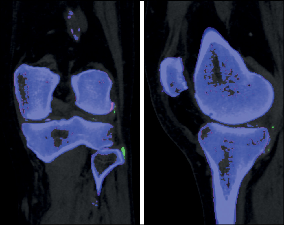 Fig. 4. Color-coded dual-energy coronal and sagittal images (left knee joint). Calcification of the medial meniscus (dual-energy computed tomography findings of the Medical Research and Education Center of the Lomonosov Moscow State University).