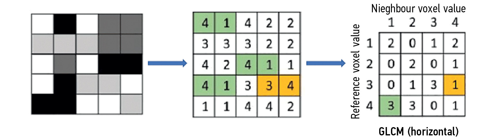 GLCM is a second-order histogram of gray levels [19]. It captures spatial relationships between pixels or voxels with predefined gray-level intensities in different directions (horizontal, vertical, or diagonal for 2D analysis and 13 directions for 3D analysis) and a predefined distance between pixels or voxels (Figure 2; hereafter, the principle of calculating matrix parameters in 2D space will be presented) [20].