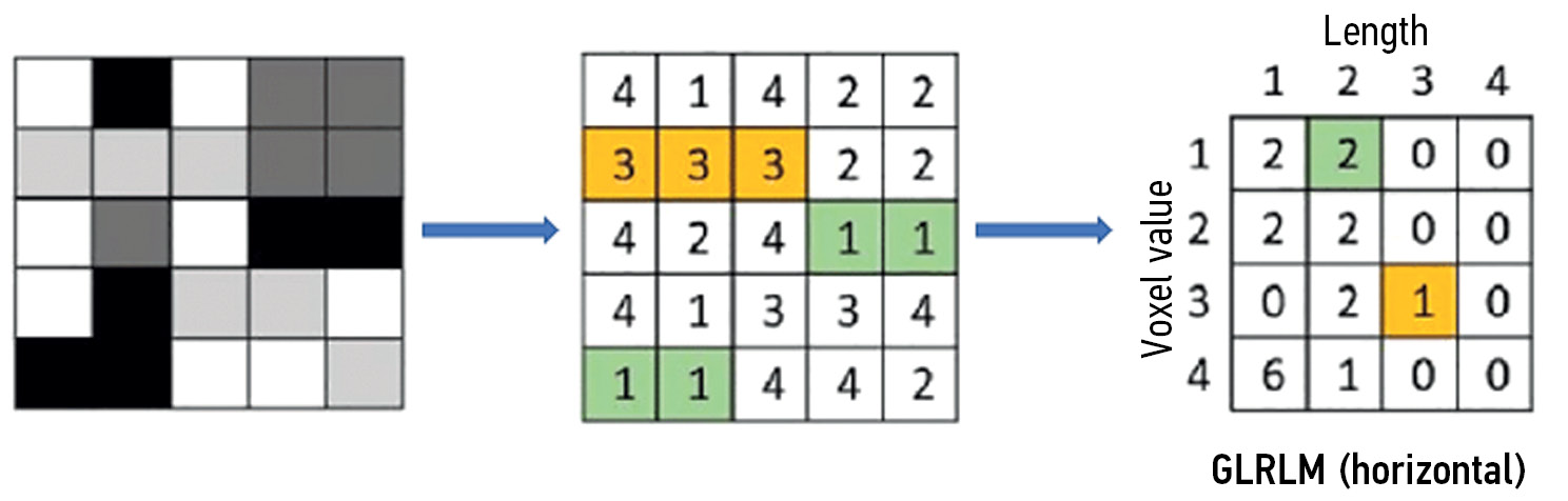 GLRLM is a matrix described by Galloway. It represents the spatial distribution of vectors of successive pixels with the same gray-level in one or more directions in two or three dimensions (Figure 3).