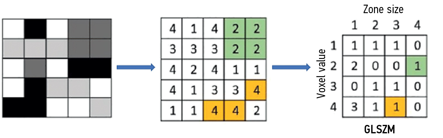 GLSZM quantitatively describes image areas with the same gray-level, consisting of adjacent voxels. According to Thibault et al. [23], GLSZM is similar to GLRLM, but the first matrix is based on the calculated number of groups (so-called zones) of interconnected neighboring pixels or voxels with the same gray-level (Figure 4). A more uniform texture will result in a wider, flatter matrix. GLSZM cannot be calculated for different directions but can be calculated for varied distances between pixels or voxels in the neighborhood. GLSZM parameters can be determined in two (eight nearby pixels) or three (26 neighboring voxels) dimensions [19].