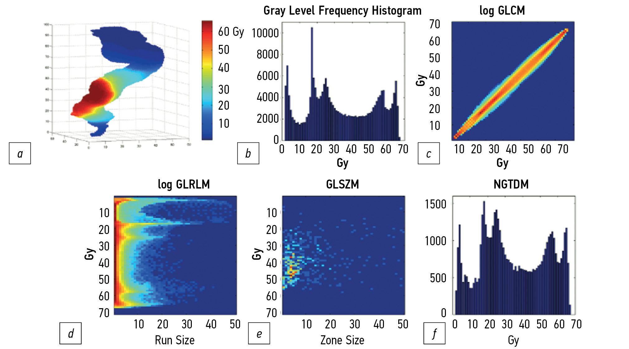 Fig. 5. Texture analysis of a 3D model of radiation dose distribution to the rectal area: (a) 3D dose distribution in the rectum, (b) gray-level frequency histogram, (c) GLCM, (d) GLRLM, (e) GLSZM, and (f) NGTDM.