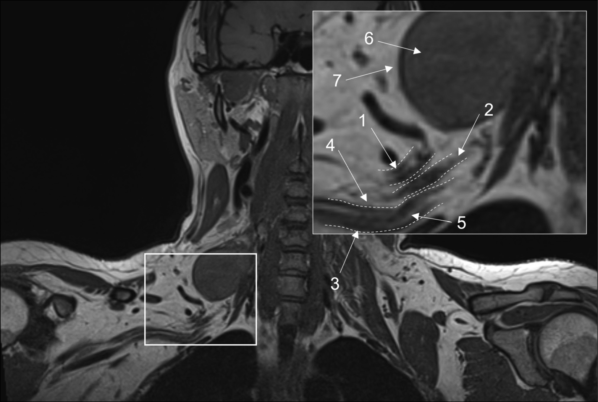 Fig. 1. Magnetic resonance imaging of the brachial plexuses in 3D-T1 mode. A coronal projection: (1) the upper trunk, (2) the middle trunk, (3) the lower trunk, (4) the perineural fatty tissue, (5) the endoneurial fat, (6) a mass lesion (schwannoma), and (7) the intact fatty tissue around the lesion.