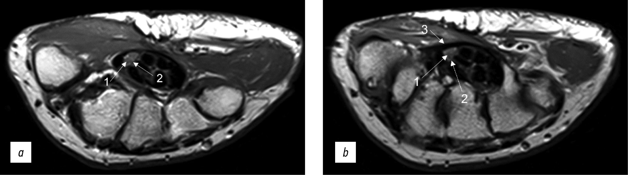 Fig. 2. Magnetic resonance imaging of the hand in T2 mode in a patient with carpal tunnel syndrome. An axial projection: (a) at the level of proximal epiphyses of metacarpal bonesand (b) at the level of distal parts of the capitate bone (1: individual fascicles as part of the median nerve, 2: epineurium, and 3: flexor retinaculum with a thickness of up to 1.29 mm).