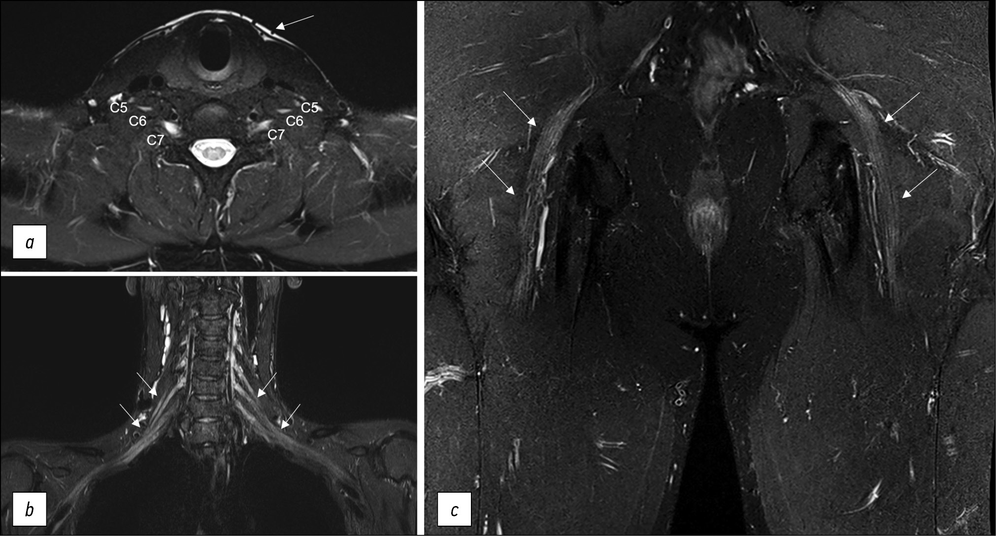 Fig. 3. Various techniques of fat suppression for magnetic resonance imaging: (a) brachial plexuses in T2-FatSat mode, an axial projection: the anterior branches of C5, C6, and C7 spinal nerves are noted, without abnormalities, with a slightly increased signal; heterogeneous fat suppression with unsatisfactory signal along the periphery of the area of interest (arrowed); (b) brachial plexuses in STIR mode, a coronal projection: homogenous fat suppression throughout the entire field of view, typical elements of brachial plexuses with a slightly increased signal (arrowed); and (c) sciatic nerves in T2-Dixon mode, a coronal projection: homogenous fat suppression, normal sciatic nerves with a slightly increased MR signal (arrowed).