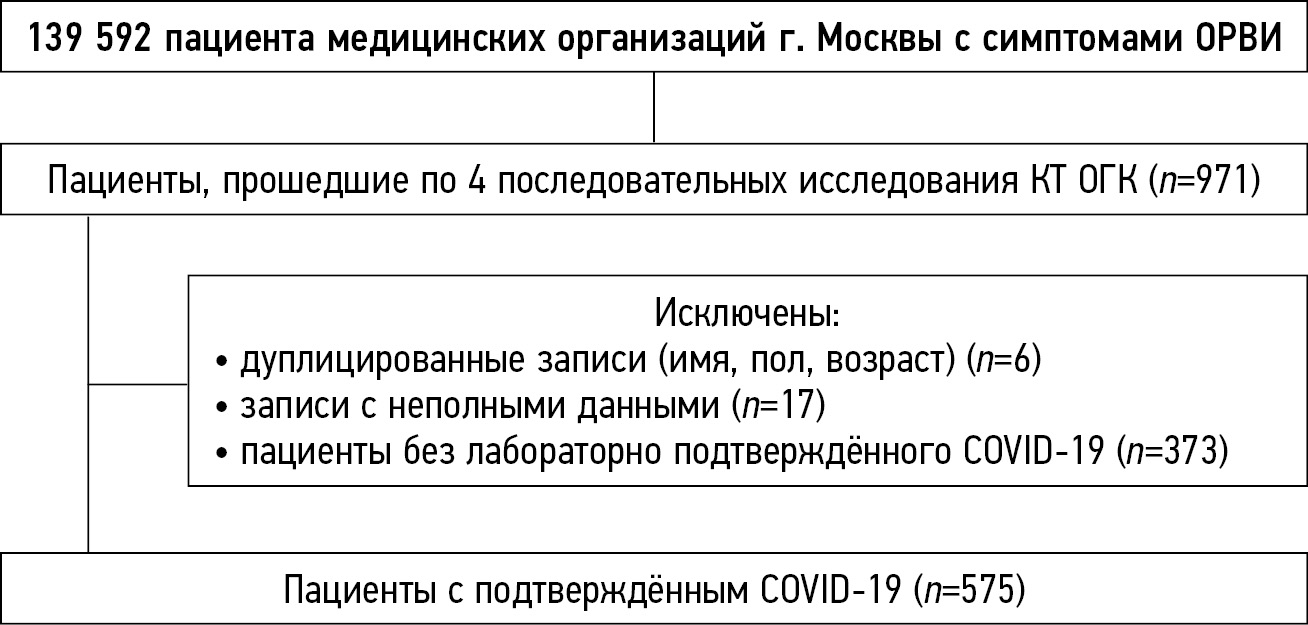 Records of 139,592 patients of medical organizations in Moscow for the period from March 1 to August 1, 2020 were assessed for compliance with the criteria for inclusion in the study. After exclusion of 139,017 participants for various reasons, for statistical analysis, data from 575 patients with confirmed COVID-19 was used, each of whom underwent four consecutive TCT (thoracic computed tomography) scans (Fig. 1).