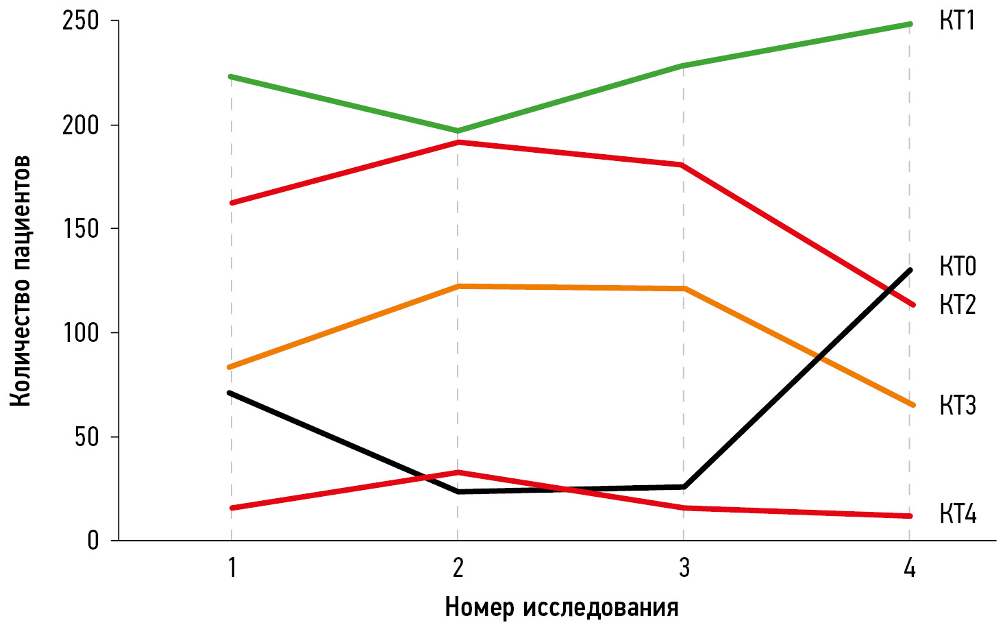 The dynamics of the distribution of disease cases in the sample according to the degree of severity followed a clear pattern. In the interval between TCT studies 1 and 2, the number of patients in categories CT0 and CT1 decreased with an increase in the number of patients of categories CT2, CT3, and CT4. In the interval between studies 2 and 3, the number of patients in categories CT0, CT3, and CT4 stabilized, and relative stability in the number of patients with mild and moderate changes was noted in the presence of an increase in the number of CT1 cases and a decrease in the number of CT2 cases. Finally, at stage 3, the tendencies of stage 1 were reversed, as there was a significant increase in the number of patients in the categories CT0 and CT1, with an equally noticeable decrease in the number of patients in the categories CT2, CT3, and CT4 (Fig. 2).