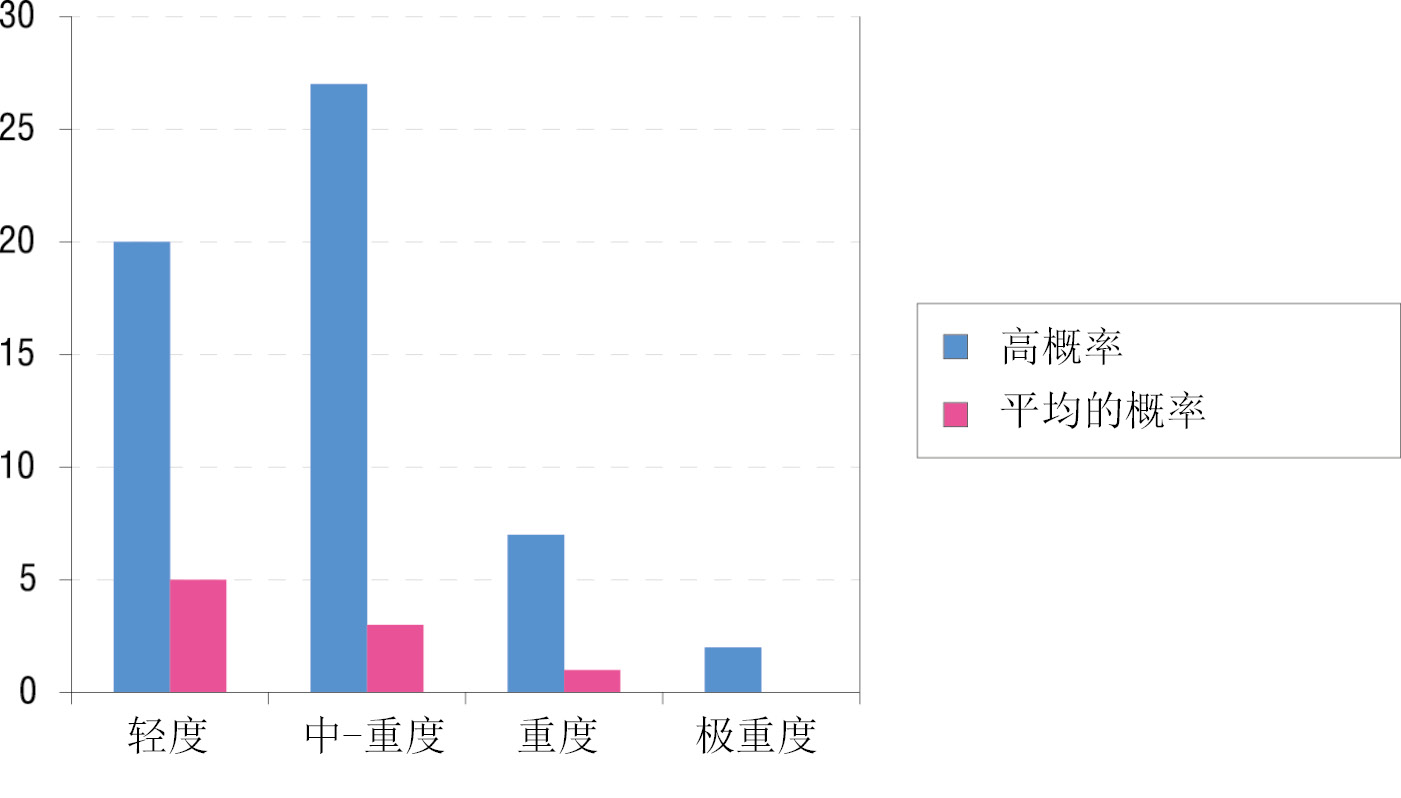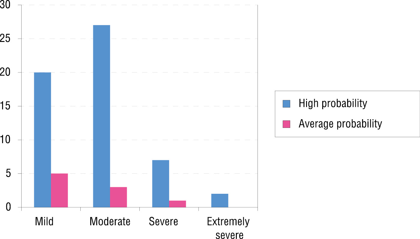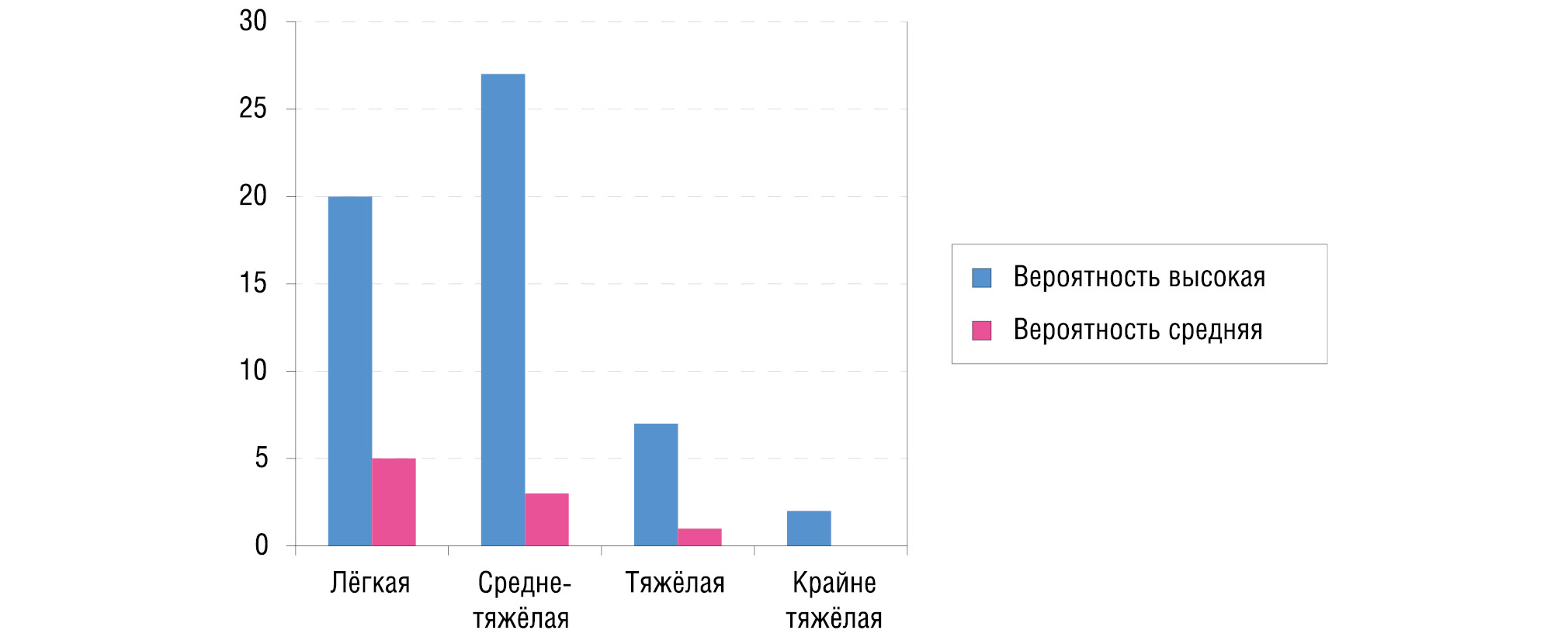 Fig. 4. Distribution of patients with a high and an average probability of COVID-19 according to the CT of the thoracic organs and depending on the disease severity.