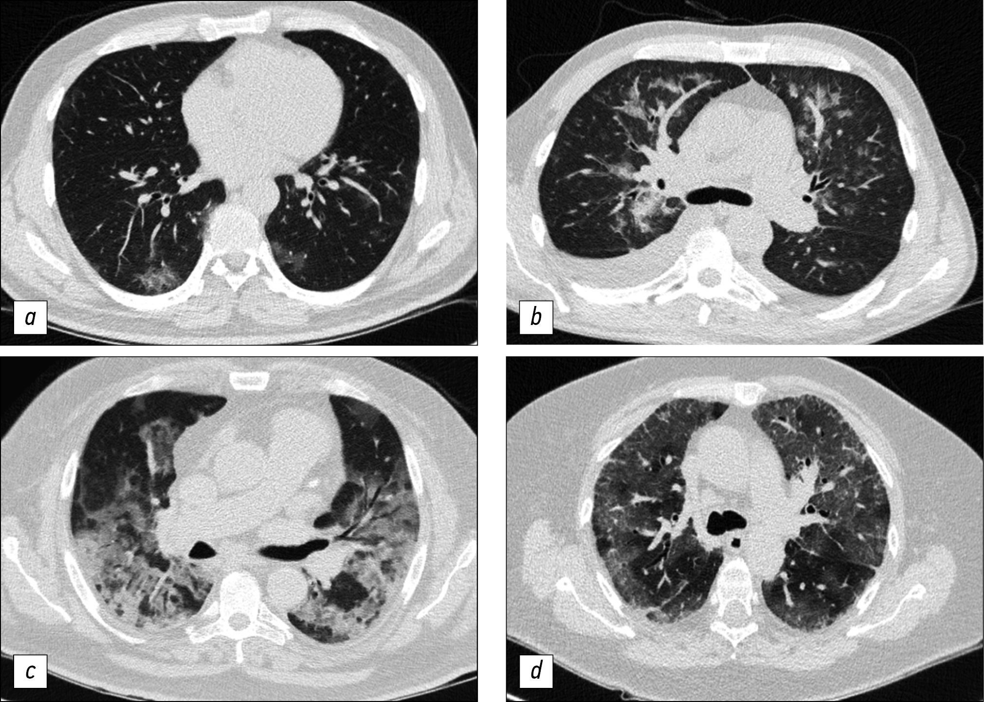 Fig. 5. Viral pneumonia severity according to the computed tomography of the thoracic organs: a ― mild changes (CT-1), involvement of the lung parenchyma by ≤25%; b ― moderate changes (CT-2), involvement of the lung parenchyma by 25%–50%; c ― severe changes (CT-3), involvement of the lung parenchyma by 50%–75%; d ― extremely severe and critical changes (CT-4), involvement of the lung parenchyma by ≥75%.