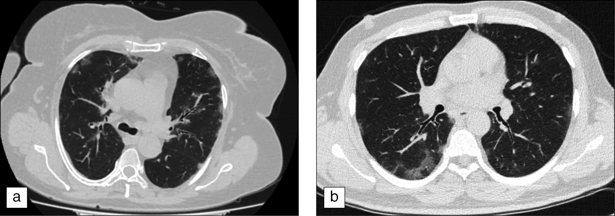 Fig. 3. Computed tomography of the chest organs; comparison of viral pneumonia images before and during the COVID-19 pandemic: a ― multiple subpleural sites of ground-glass opacity of the lung tissue (April 2019); b ― a similar presentation of an atypical pneumonia of viral origin (April 2020).