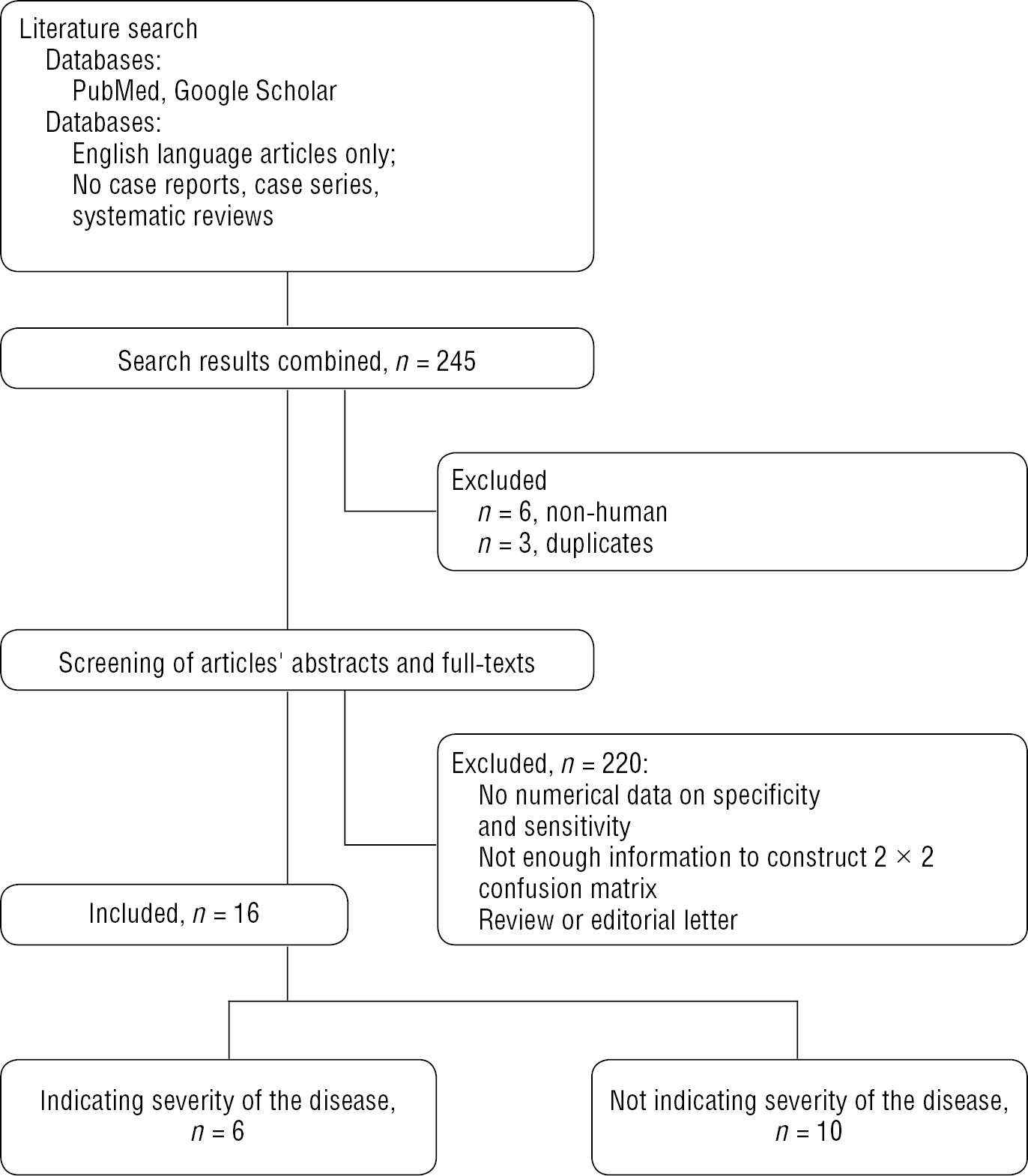 Study selection. We included 16 studies in this review. The search in PubMed and Google Scholar databases provided 245 studies imported into a Mendeley library. Of these, six studies were discarded because they were conducted on non-human subjects. After adjusting for duplicates, 236 studies remained. Of these, 220 studies did not meet the criteria and were discarded after abstract or full-text reviewing (Figure 1). We examined the full texts of the remaining 16 studies [19–34], and only six of these analyzed the diagnostic accuracy of US in the context of the disease severity [19, 20, 27–30]. However, only three studies enrolled patients of all clinical grades: mild, moderate, and severe stages of the disease [19, 20, 28]. The other three studies included only critically ill patients [27, 29] or evaluated the prognostic value of lung US in predicting the need for non-invasive respiratory support [30]. A study by Veronese et al. stood out because they analyzed the data of bedridden nursing home patients, aged 84.1 ± 9.8 years [24]. For these patients, mortality was associated with a lung US score of 4 (maximum value 36), primarily due to this cohort’s general health.
