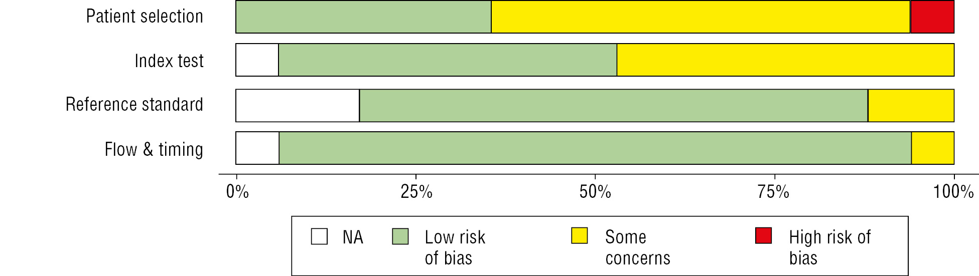 Seven studies properly reported the details of both index and reference standard tests. The interobserver variability was estimated only in three studies [21, 25, 32]. Three studies only (19%) reported the interval between the two tests, but the majority (87%) correctly indicated whether all patients used the same reference standard.
