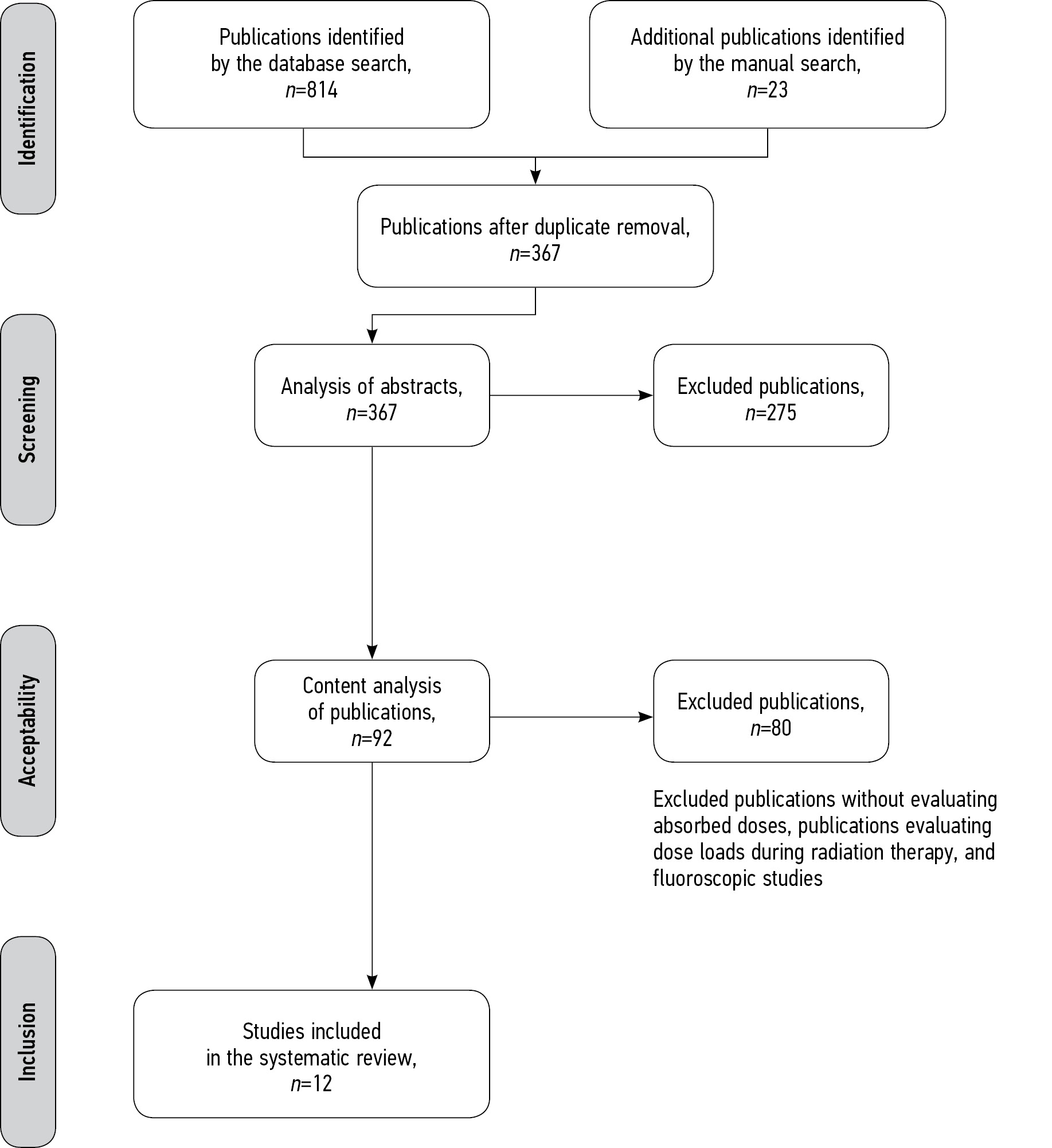 Following the database search query, duplicate results were excluded. The content of the selected studies, including parameters such as the year of publication, study design, purpose, methodology, and results were analyzed, and publications on non-ionizing techniques of diagnostic radiology were excluded. The systematic review excluded studies that did not measure fetal and uterus absorbed doses and studies measuring dose loads during radiation therapy and fluoroscopy. Finally, the systematic review included 12 studies. The study design is presented in Fig. 1.