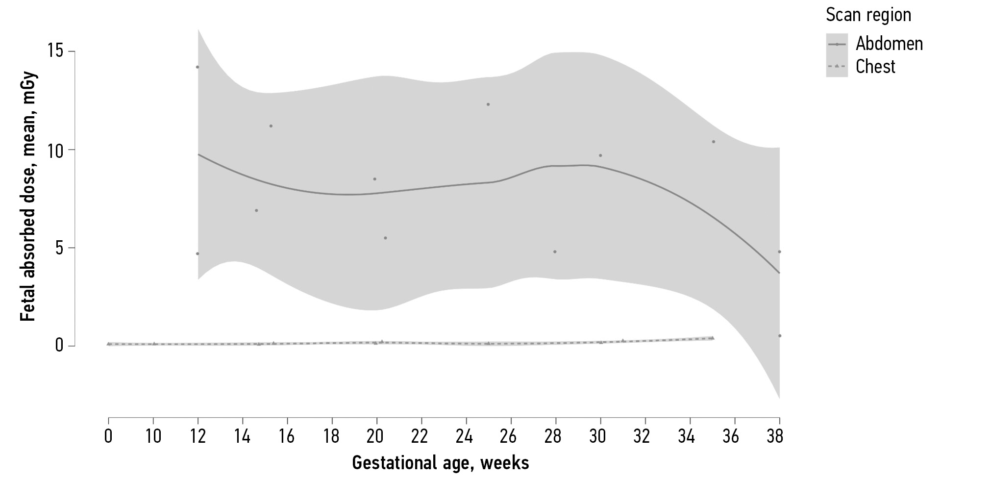 Source | Volume CT dose index (CTDI vol), mGy | DLP, mGy×cm | Gestational age, weeks | Fetal absorbed dose, mean, mGy | Uterus absorbed dose, mean, mGy |