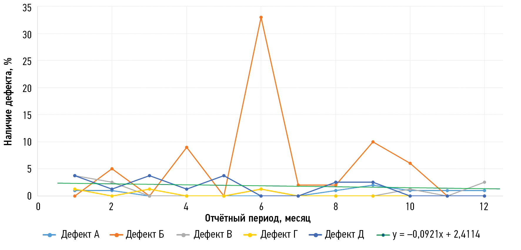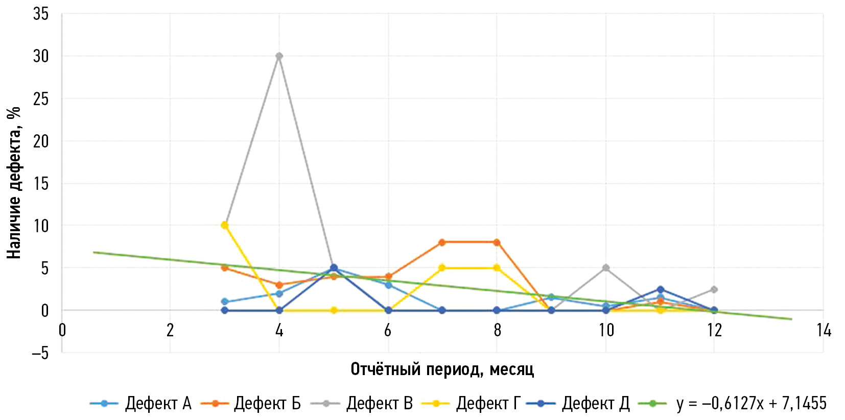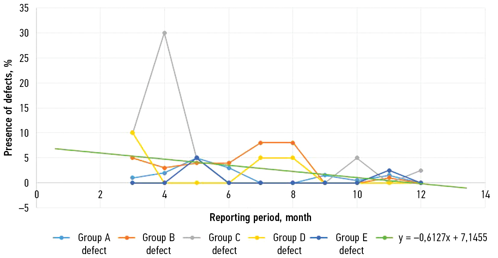 Fig. 1. Changes in detection of the average number of each technological defect for software based on artificial intelligence for mammography. Defects are divided into groups in accordance with order no. 51 of the Moscow Department of Health dated January 26, 2021.