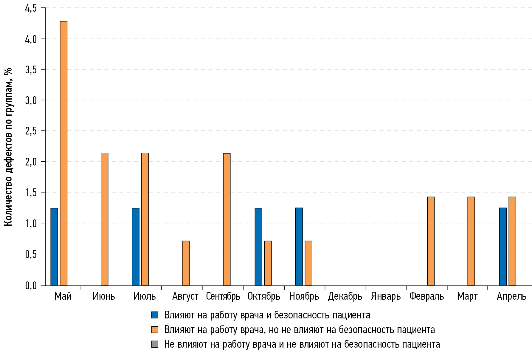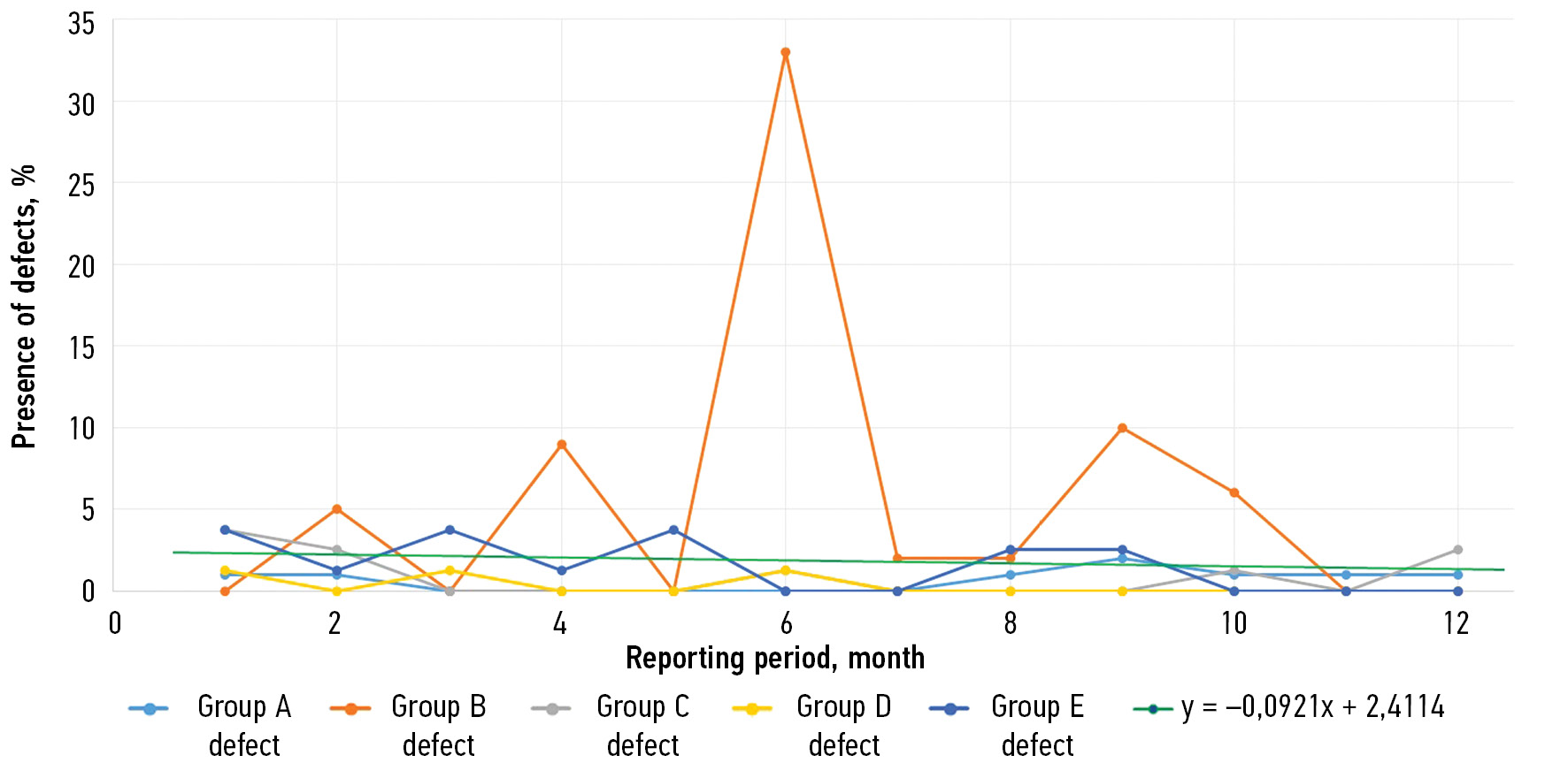 Fig. 2. Changes in the detection of the average number of each technological defect for software based on artificial intelligence for the brain computed tomography modality (presence or absence of intracranial hemorrhage). Defects are divided into groups in accordance with order no. 160 of the Moscow Department of Health dated November 3, 2022.