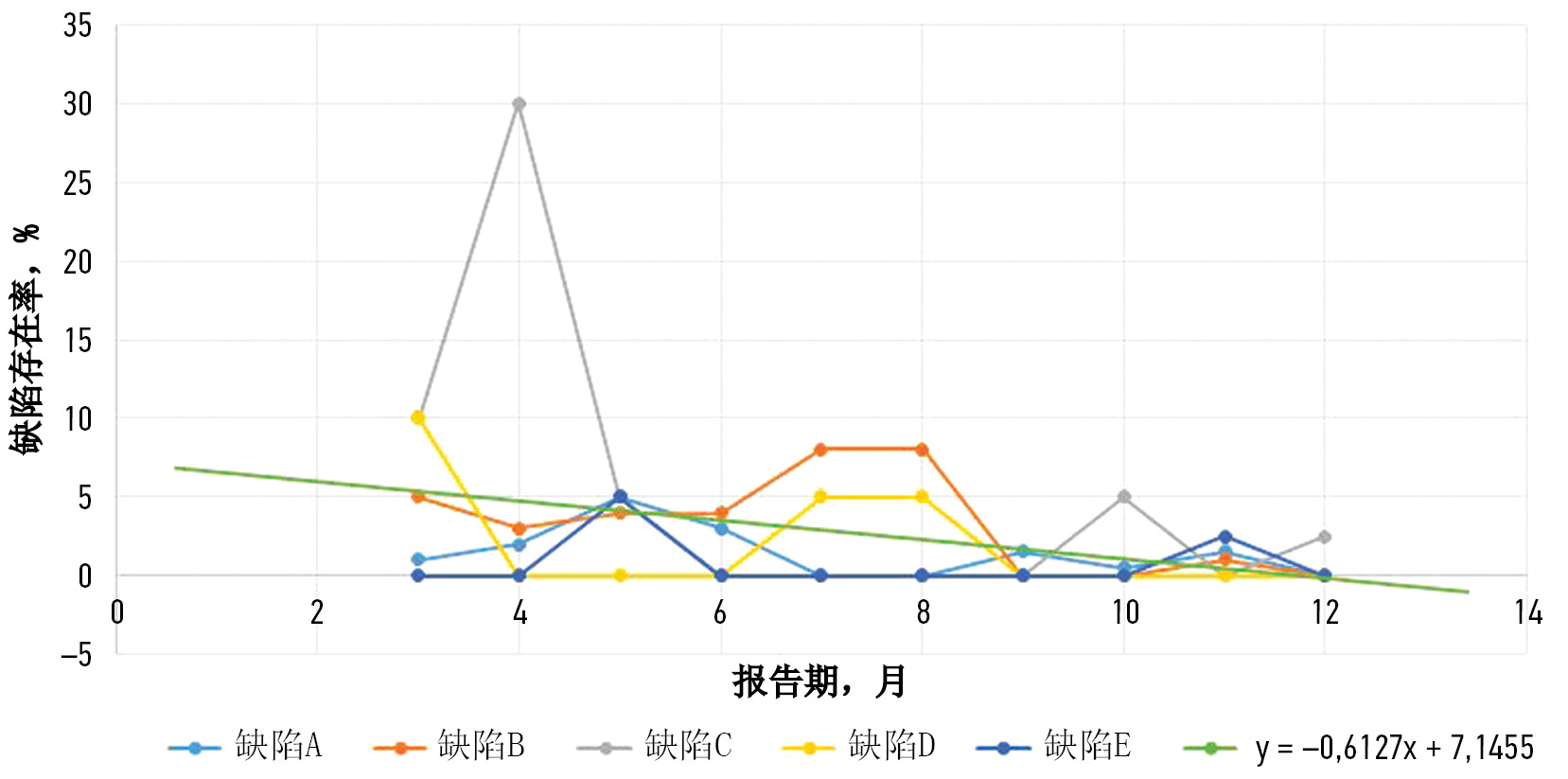 Fig. 8. Number of defects in each group over time; modality: computed tomography.
